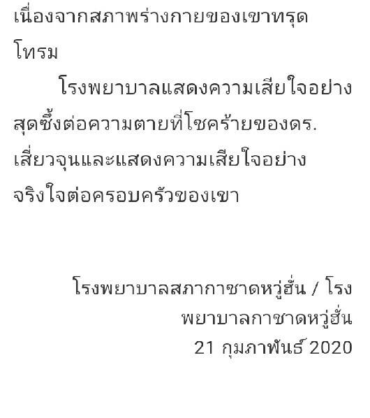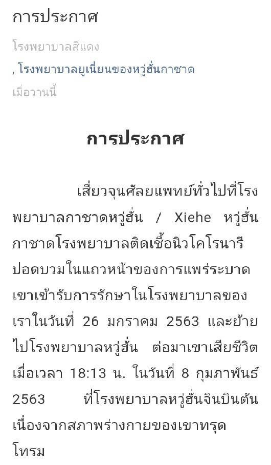 เสียชีวิตอีกหนึ่งราย ทางการจีนเพิ่งประกาศเมื่อวันที่ 21 กุมภาพันธ์ หลังจากแพทย์คนนั้นเสียชีวิตมาแล้ว 13 - 14 วัน