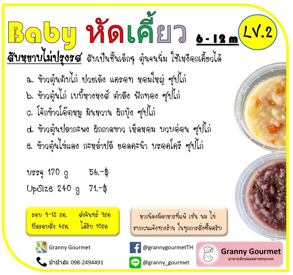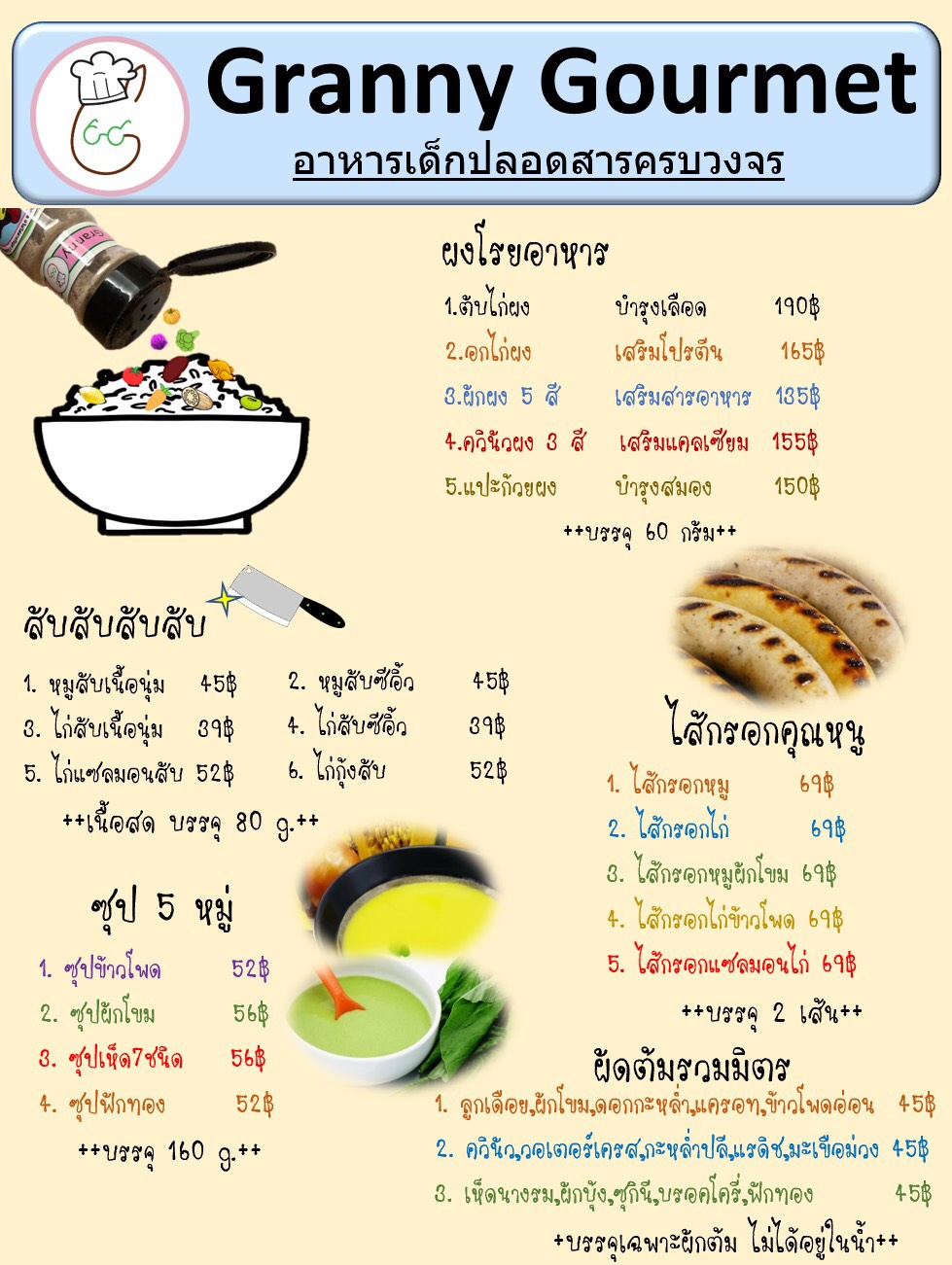 มีแบ่งเนื้อสัมผัสตามอายุเด็ก จะเหลวเนียนกลืนง่าย จะข้นขึ้นมาอีกนิด มีเนื้ออีกหน่อย หรือเป็นชิ้นเป็นอันแบบอาหารผู้ใหญ่เลยก็มีค่ะ .. แถม GrannyGourmet เค้าเพิ่มเติมให้ครบวงจรด้วยไลน์สินค้าอย่างผงโรยอาหาร ไส้กรอกปลอดสาร ซุปต่างๆ