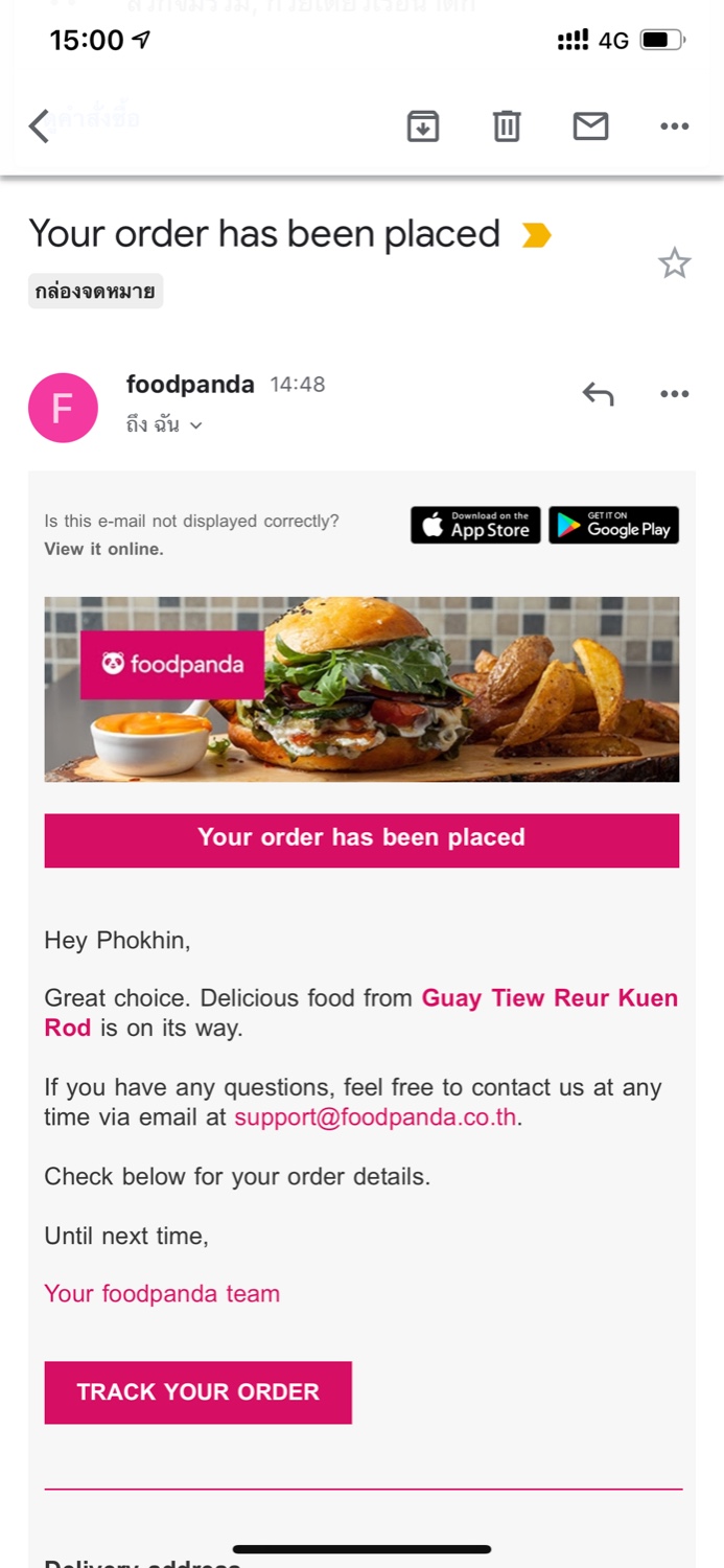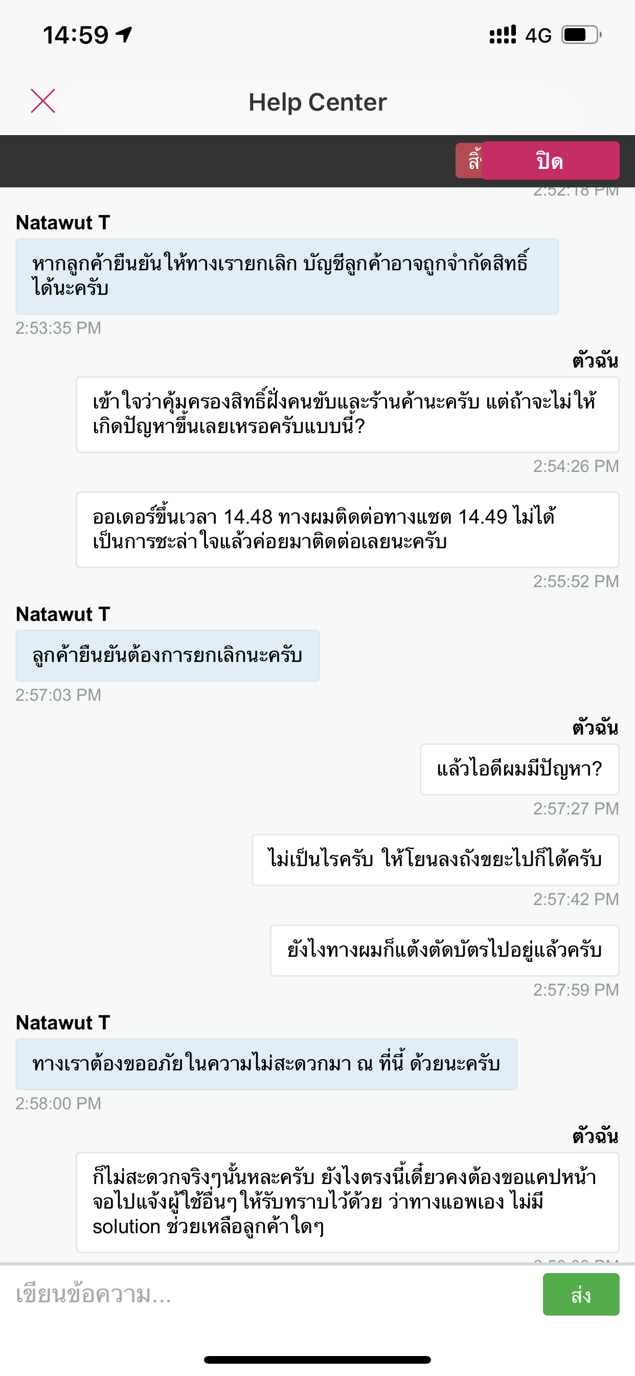 ออเดอร์ไป 14.48 แจ้งว่าระบุที่อยู่ผิดไปที่เวลา 14.49 สรุปก็คือไม่สามารถช่วยอะไรได้ เป็น support ที่ห่วยแตกที่สุดเท่าที่เคยพบมาครับ เวลาไม่ถึงนาทีแจ้งว่าทำอาหารไปแล้ว อย่างมากสุดผมว่าก็คงกดรับออเดอร์ไว้เท่านั้น ไม่มีความพยายามจะประสานงานหรือแสดงให้เห็นว่าได้เป็นตัวกลางเพื่อนช่วยเหลืออะไรทั้งสิ้น / ล่าสุดก็ว่าถ้าหาคนรับแทนไม่ได้ก็คงให้โยนทิ้งไปครับ