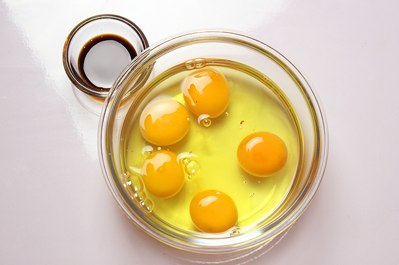 • เริ่มทำไข่ข้นก่อน โดยตีไข่ไก่ให้ละเอียดใส่ซอสถั่วเหลืองเล็กน้อย