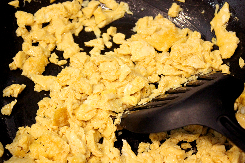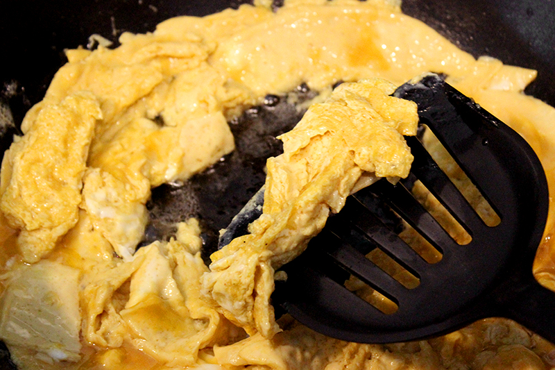 • เมื่อไข่เริ่มเข้ารูปให้ใช้ทัพพีสับไข่ให้เป็นชิ้นๆ