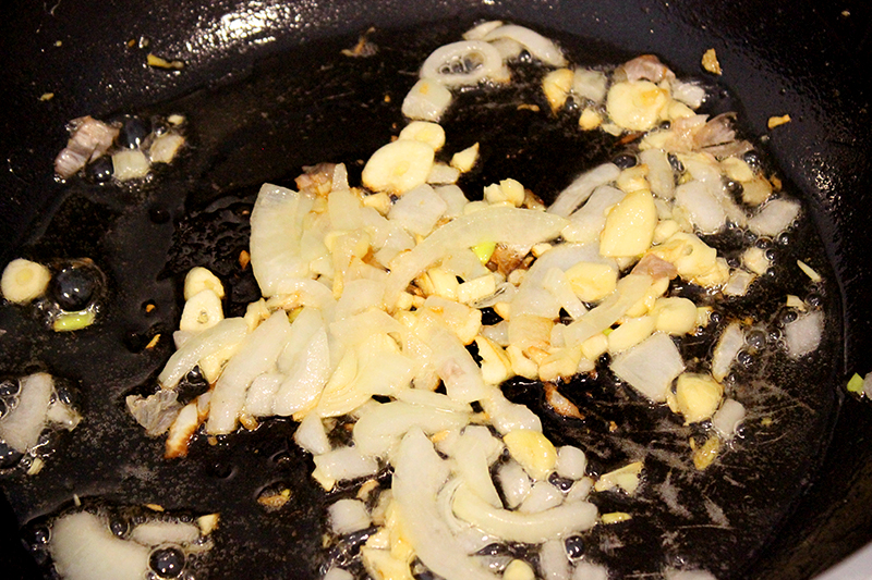 • เตรียมทำข้าวผัด นำกระเทียมและหอมหัวใหญ่มาเจียวให้หอม