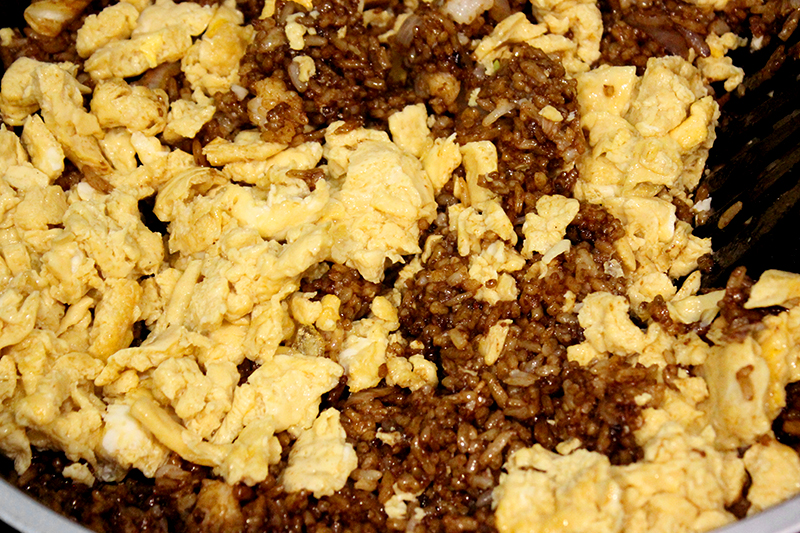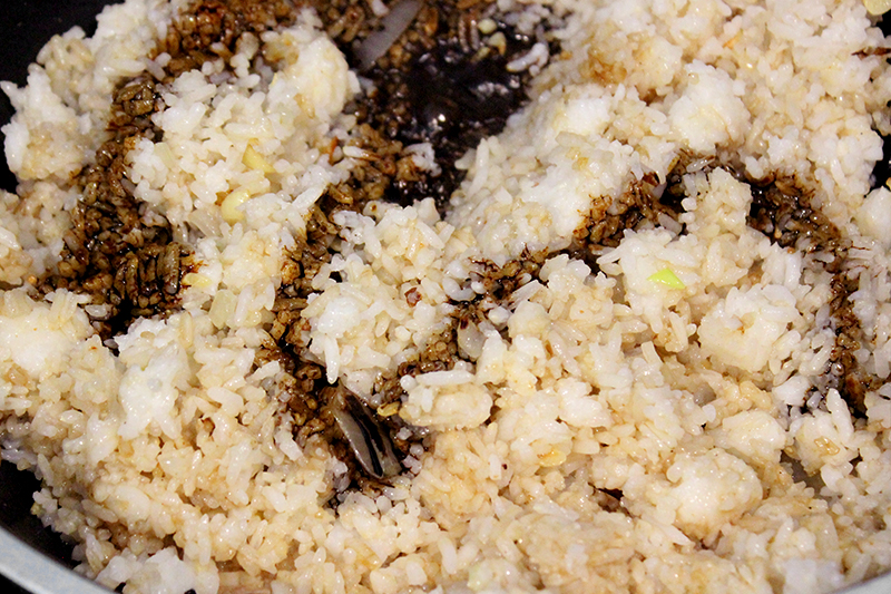 • จากนั้นนำซีอิ๊วดำใส่ลงไปบนข้าว ให้ใส่ทีละน้อยเพราะซีอิ๊วดำจะทำให้อาหารสีเข้มขึ้นมาก