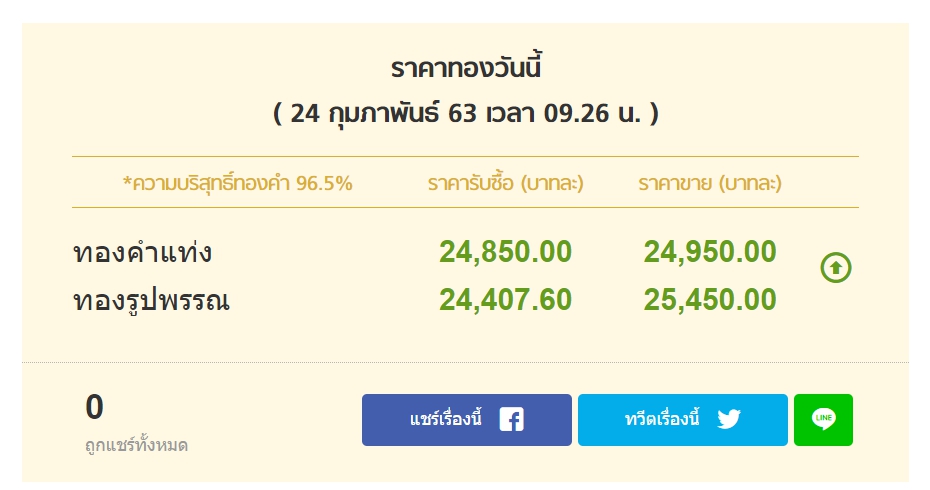 ราคาทองวันนี้ ราคาทองคำ วันที่ 21 กุมภาพันธ์ 2563 เวลา 09:25 น. ราคาทองคำแท่ง รับซื้อบาทละ 24,150.00 บาท ขายออกบาทละ 24,25