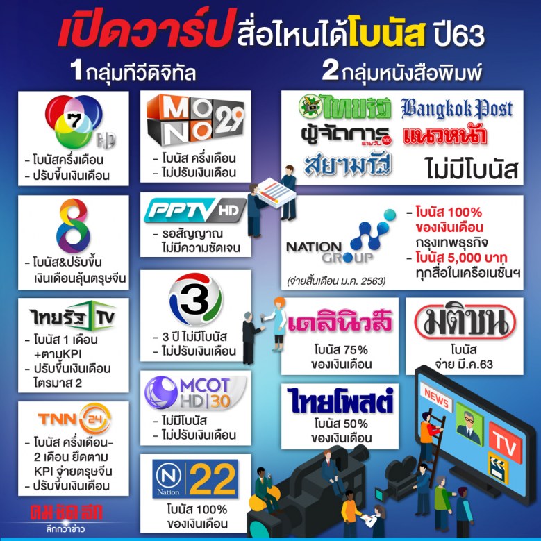 สำหรับปี 2562 ที่ผ่านมา องค์กรสื่อแต่ละค่าย ทั้งค่ายใหญ่ ค่ายเล็ก มีการให้โบนัสกับฝ่ายข่าว-กองบรรณาธิการข่าว-พนักงาน กันอย่างไรบ้าง “เพจจุลสารราชดำเนิน” ไปสำรวจมานำเสนอให้ทราบพอสังเขป