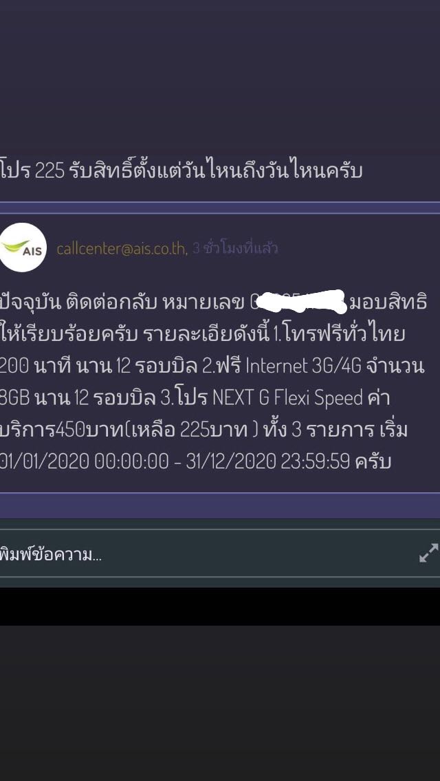 คือตอนนี้เราใช้โปรพิเศษที่ทาง AIS มอบให้เรา ได้เน็ต 20 GB โทร 200 นาที และบวก On Top โทรฟรี 200 นาที ปรากฏว่า เราไปเจอพี่ท่านนึงได้สิทธิเน็ตฟรีเพิ่มด้วย พอเราโทรไปขอบ้างกับไม่ให้สะงั้น ทั้งๆที่จ่ายเงินเท่ากัน😭