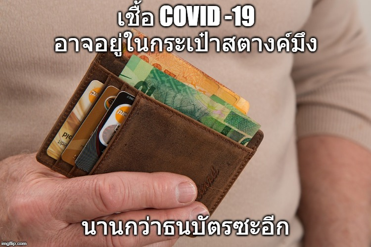 ดังนั้น ของที่เราใช้มือหยิบจับบ่อยๆ เช่น ธนบัตร นี่ก็ต้องระวัง เช่น ถ้ามีคนที่ติดเชื้อ ไอจาม เอามือที่เปื้อนเสมหะ น้ำมูก ไปจับธนบัตร แล้วเรารับธนบัตรนั้นมา แล้วมือไปแตะตรงที่มีเชื้อ แล้วเอามาแตะปาก แตะจมูกเรา ก็มีสิทธิโดนได้