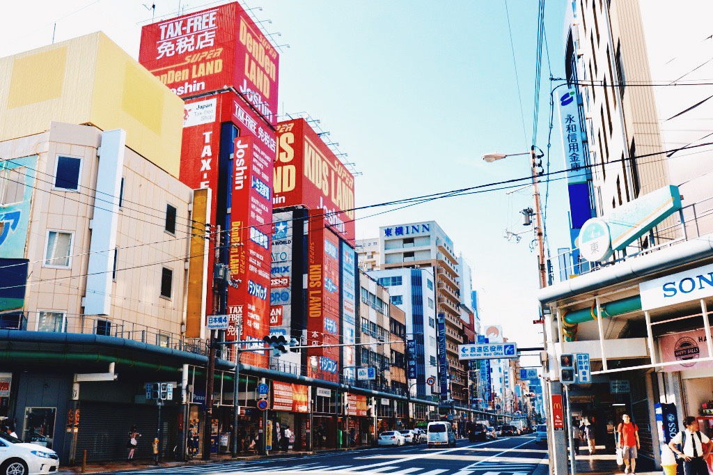 เดินไปเรื่อยๆ ก็จะเจอร้านเครื่องใช้ไฟฟ้า หรือร้านอนิเมะเรียงรายอยู่มากมาย ซึ่งจะมีตึกสีแดงสูงเด่นอยู่คู่กัน 2 ตึก สองตึกนี้ก็คือสองจุดแรกที่เราจะไปดูกันค่ะ