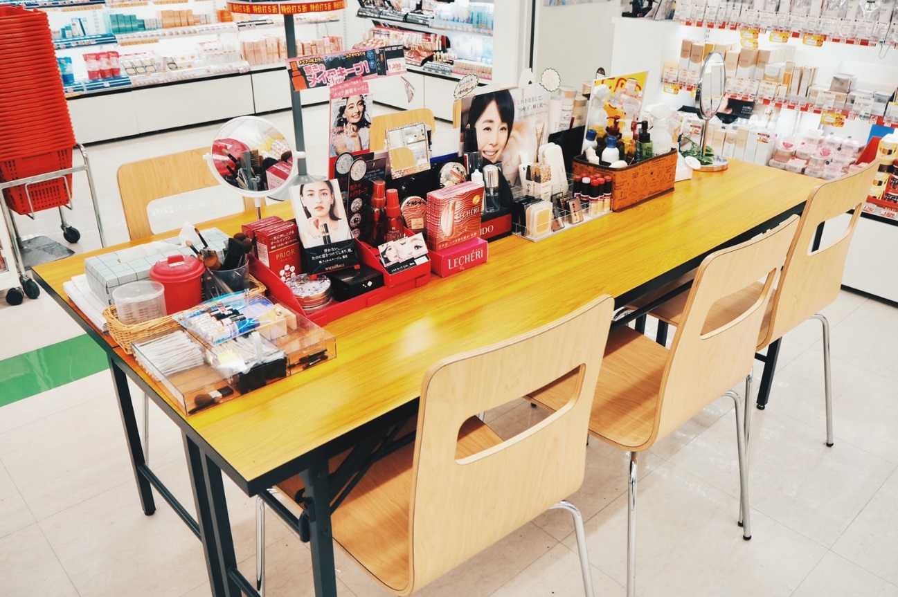 มุมนี้เป็นโซน “โต๊ะทดลองเครื่องสำอาง” ซึ่งจะมีเครื่องสำอางชนิดต่างๆ ไม่ว่าจะเป็นครีมบำรุงผิวหน้า หรือเครื่องสำอางที่มีทั้ง แป้ง ลิป รองพื้น ครีมกันแดด ได้ลองสินค้าก่อนตัดสินใจซื้อ ลองเสร็จแล้วก็มีอุปกรณ์แต่งหน้า หรือเช็คเครื่องสำอางเตรียมไว้ให้ครบเลยด้วย