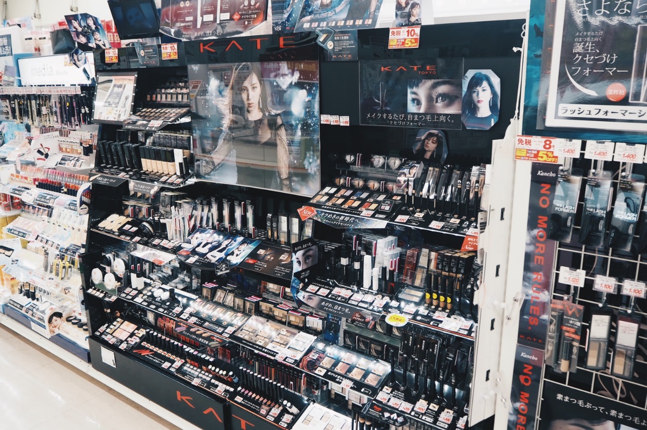 สินค้าแบรนด์ต่างๆ แน่นเต็มแผง ตอนที่เราไปแบรนด์ KATE ในเครือชิเซโด้ มีสินค้าออกใหม่หลายตัวเลย ทั้งอายชาโดว์ หรือ Color Corrector เนื้อครีม
