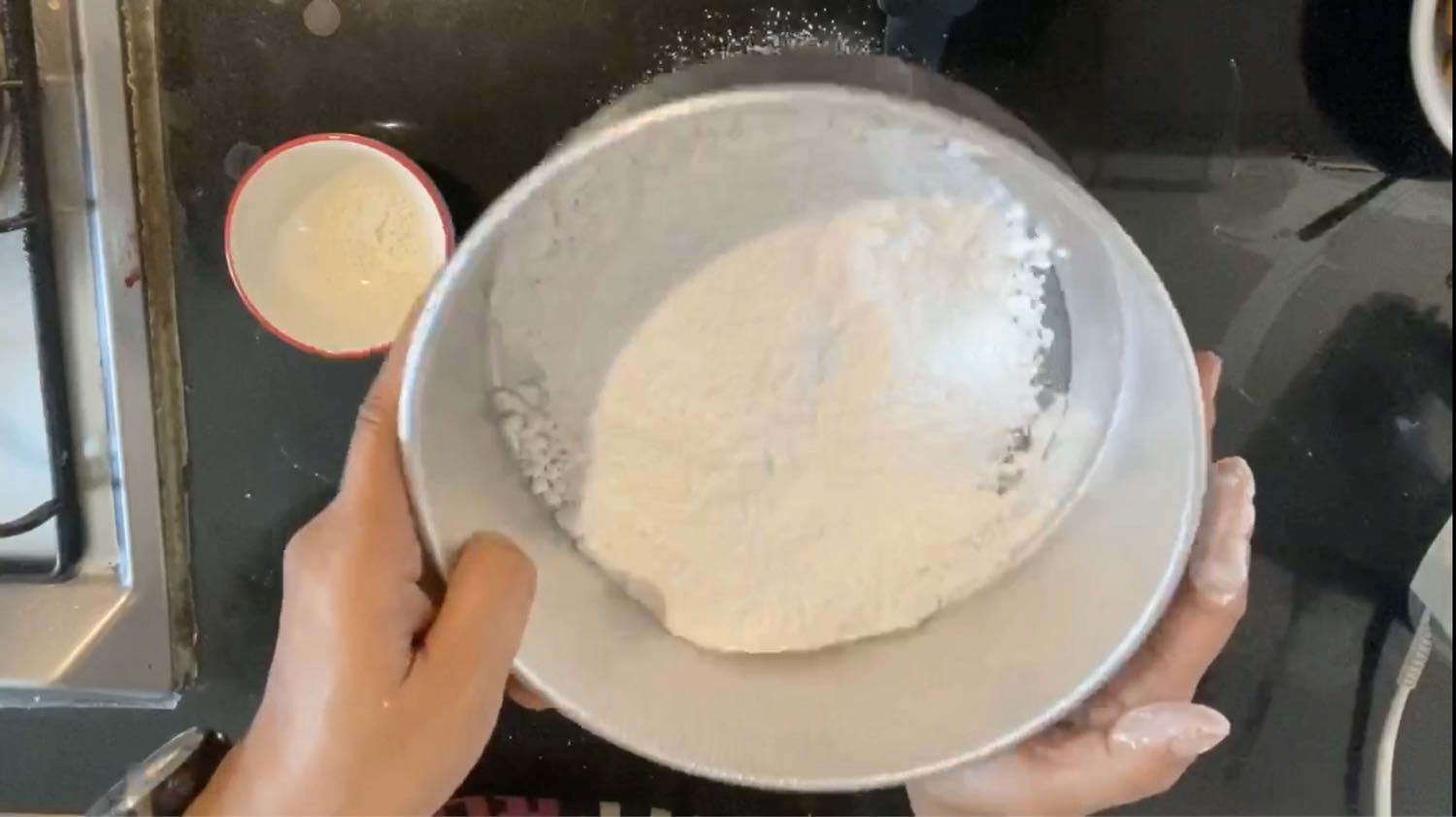 ร่อนน้ำตาลไอซ์ซิง + เกลือ เข้าด้วยกัน แล้วใส่เนยขาวลงไป