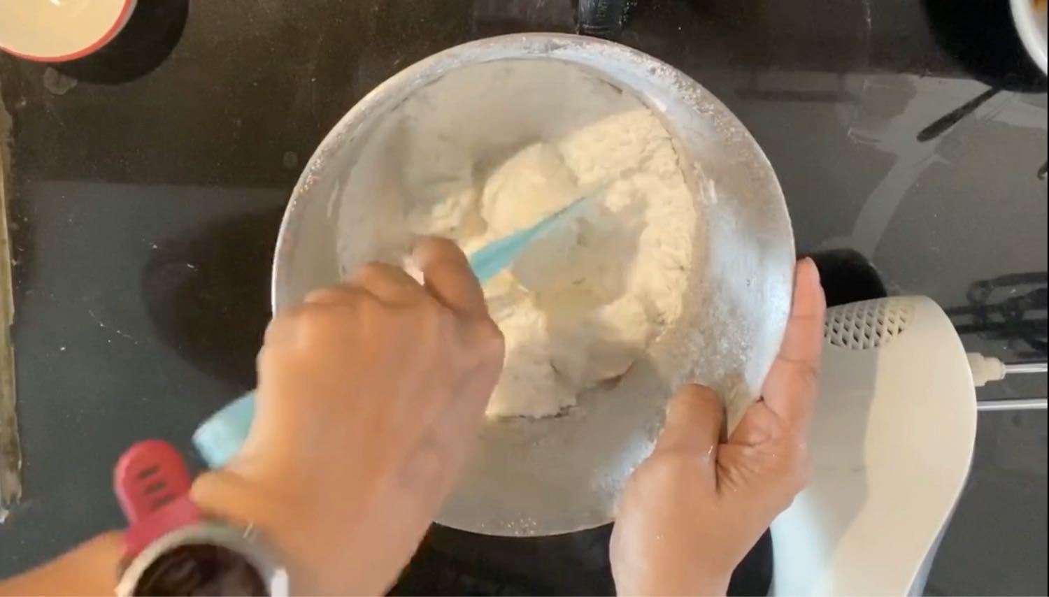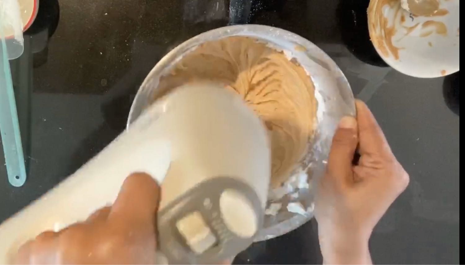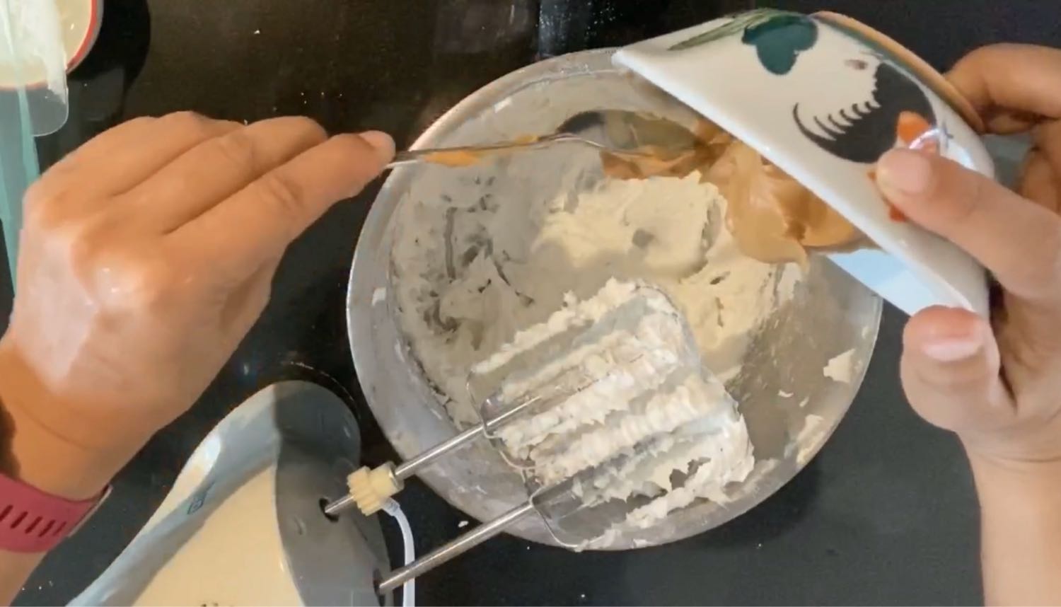 ใช้ไม้พายคลุกเคล้าเพื่อไม่ให้น้ำตาลไอซ์ซิงฟุ้งกระจาย หลังจากนั้นใช้เครื่องตีให้เข้ากัน
