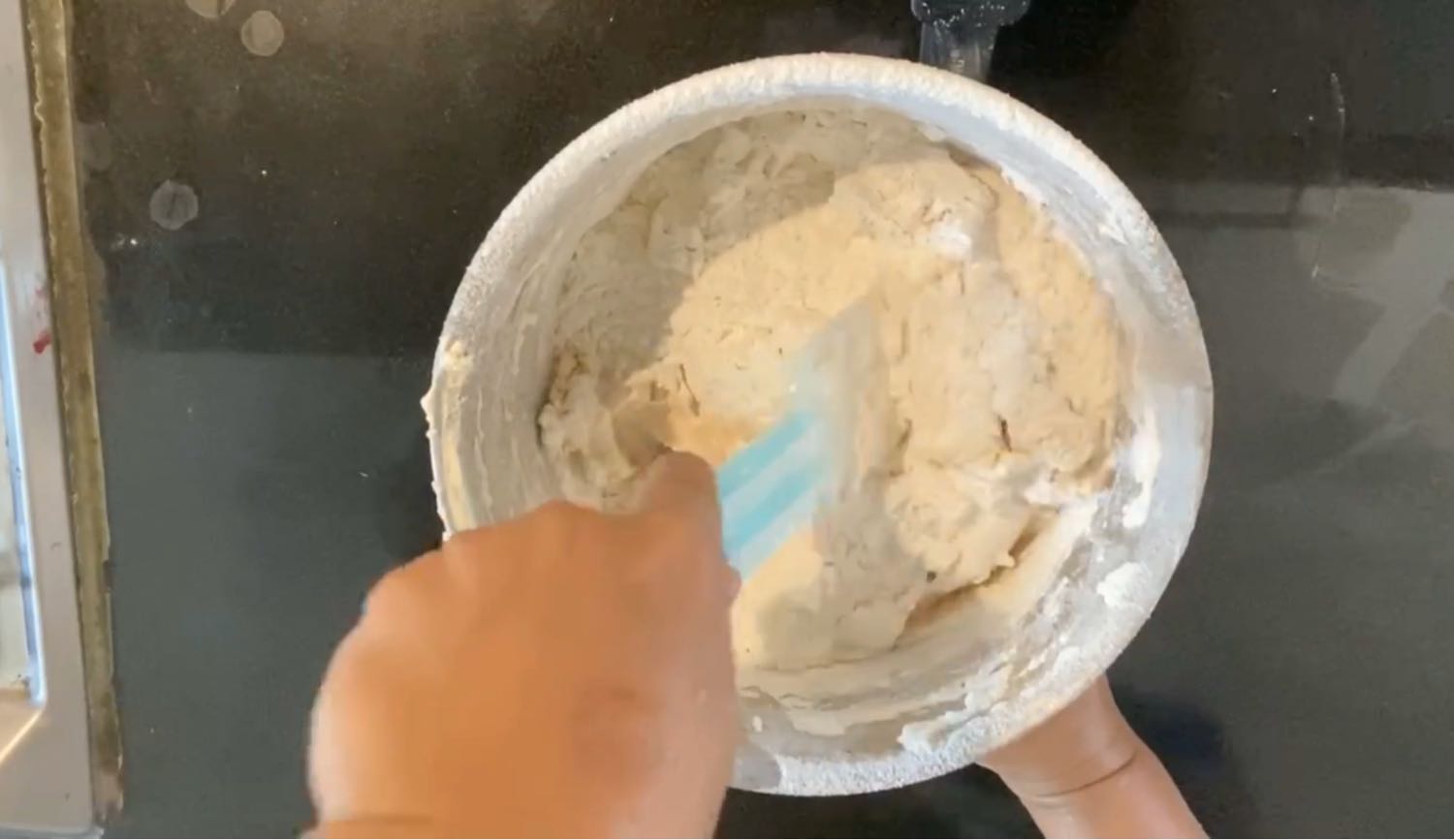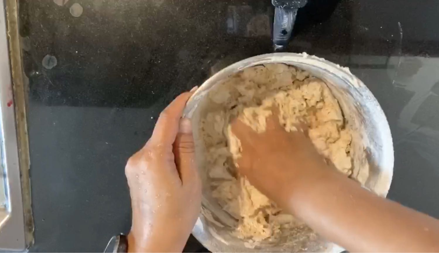 แล้วใส่แป้งสาลี แล้วใช้มือนวดๆๆ จนเนื้อเนียน