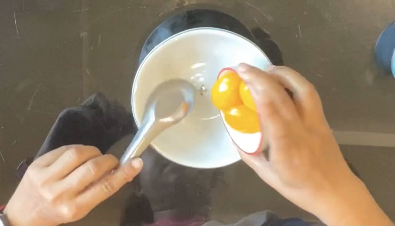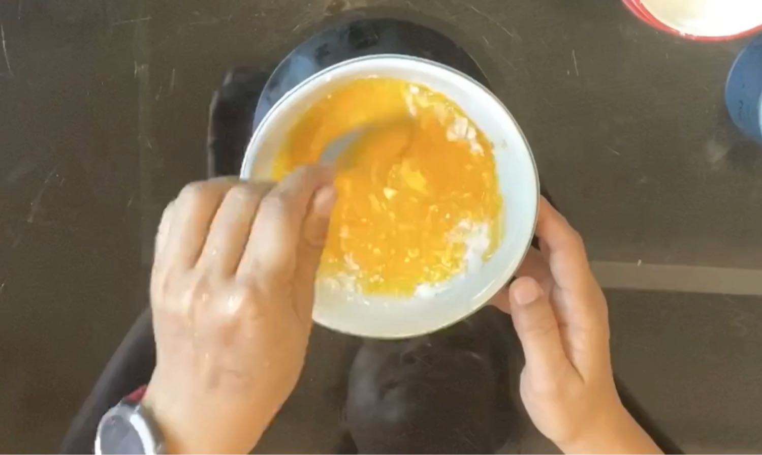 ใส่สีเหลืองผสมอาหารลงไปนิดหน่อย เพื่อให้สีชัดขึ้น แล้วคนเข้าหากัน