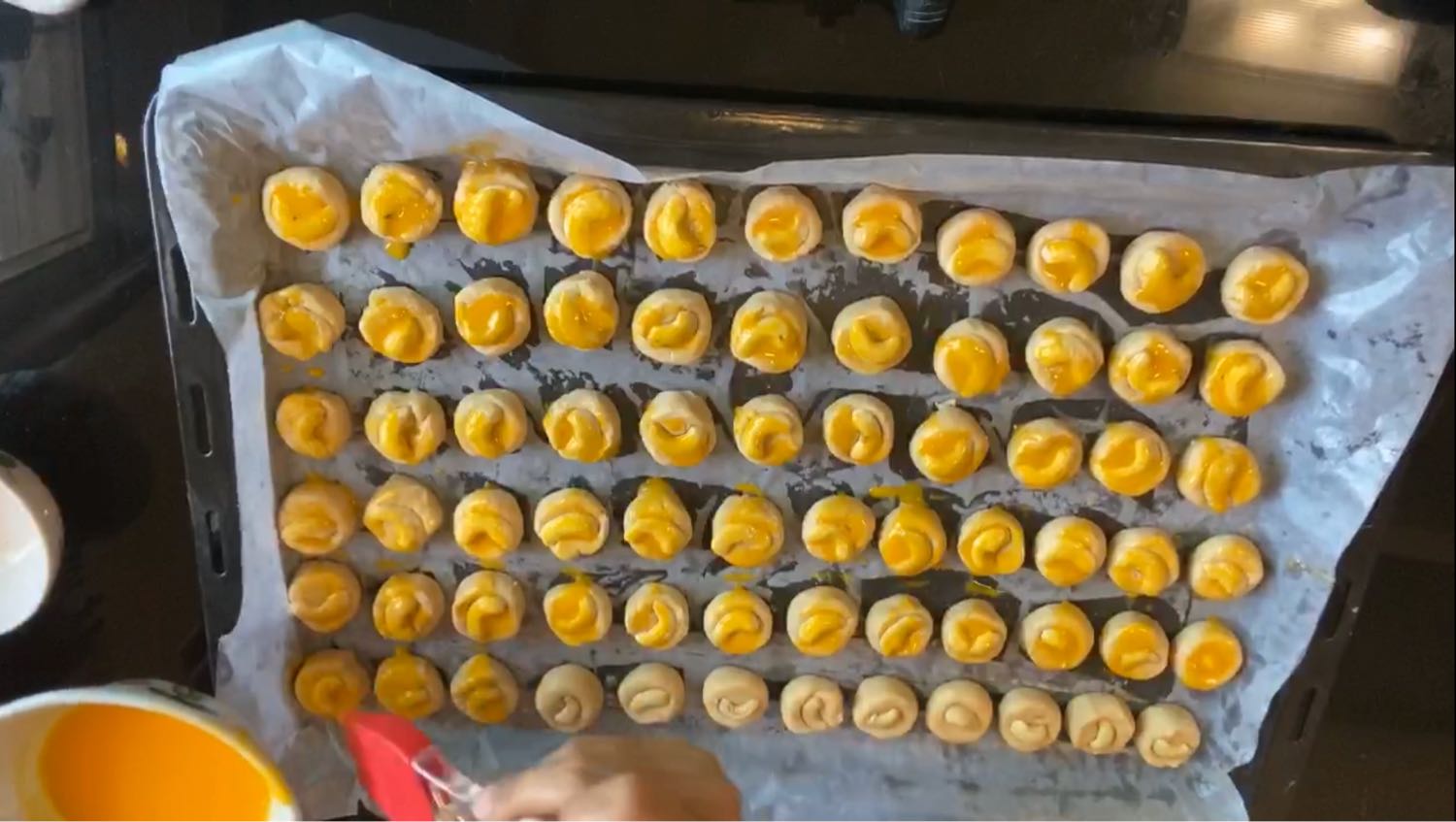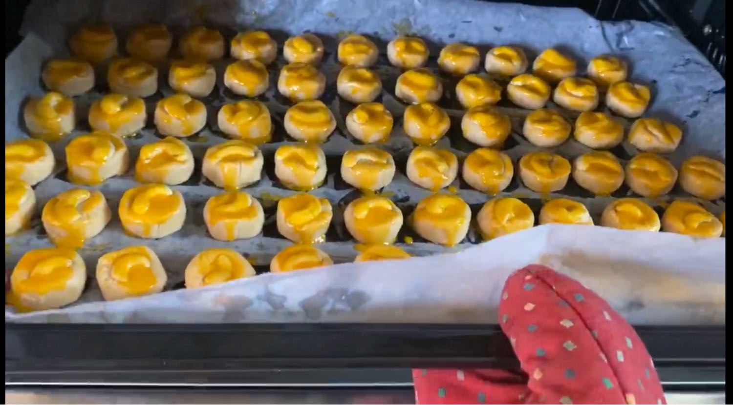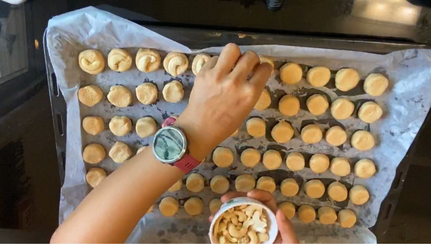 ปั้นแป้งเป็นก้อนกลมๆเล็กๆ มาเรียงที่ถาด แล้วนำเม็ดมะม่วงวางบนหน้าคุ๊กกี้ เสร็จแล้วนำไข่แดงที่ผสมไว้มาทาบนตัวค