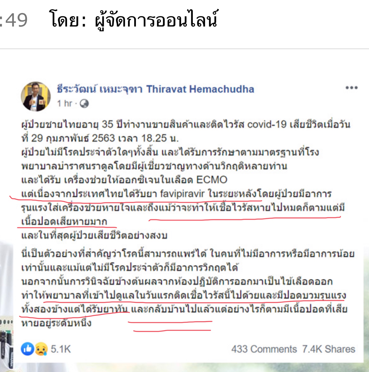 "หมอธีระวัฒน์" เผยมีคนไทยเสียชีวิตจาก "เชื้อโควิด-19" รายแรก เพราะได้รับยา ช้าไป
