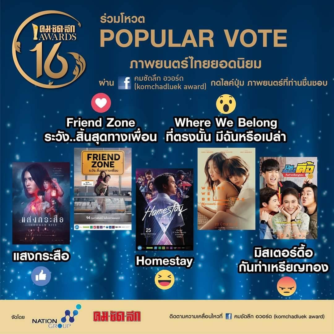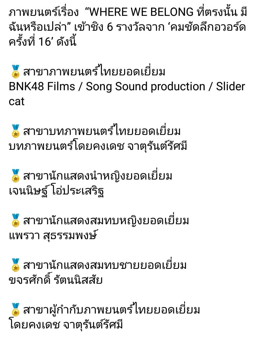 ดีจร้า.....ทุกคนคงร่วมเชียร์และลุ้นกับการเข้าชิงรางวัล และได้ทราบผลการประกาศรางวัลกันแล้ว ดีใจกับ WhereWeBelong ด้วยครับ ที่ได้ถึง2 รางวัล ทั้ง บทภาพยนต์ยอดเยี่ยม และภาพยนต์ยอดนิยม link ถ่ายทอดงา