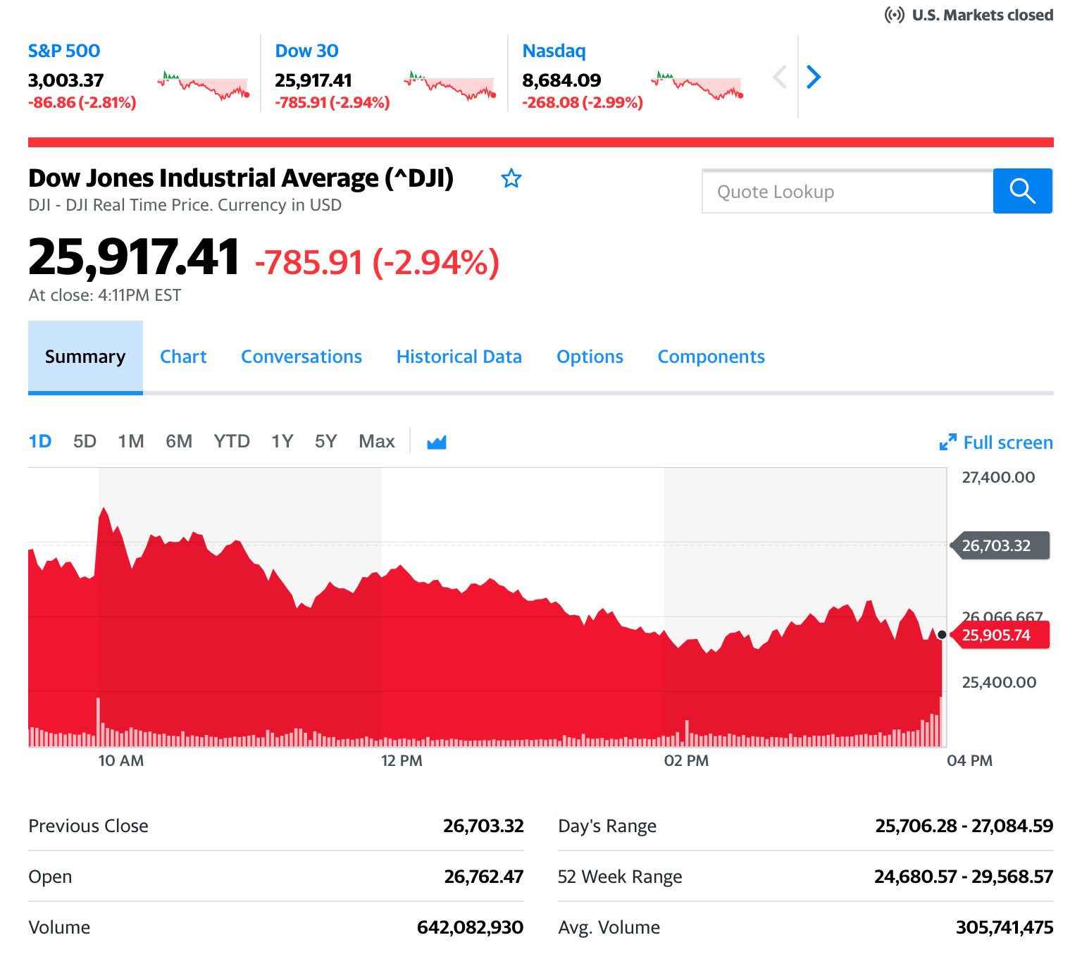 ดัชนีเฉลี่ยอุตสาหกรรมดาวโจนส์ปิดที่ 16,058.35 จุด ร่วงลง 469.68 จุด หรือ -2.84% ดัชนี แนสแดค ปิดที่ 4,636.11 จุด ลดลง 140.40 จุด หรือ -2.94% ดัชนี เอสแอนด์พี 500 ปิดที่ 1,913.85 จุด ลดลง 58.33 จุด หรื