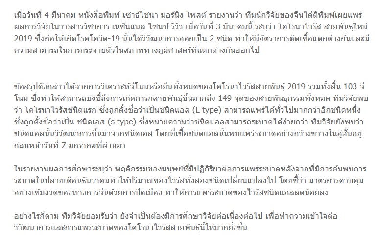 จีนเผยไวรัส ‘โควิด-19’ กลายพันธุ์เป็น 2 ชนิด