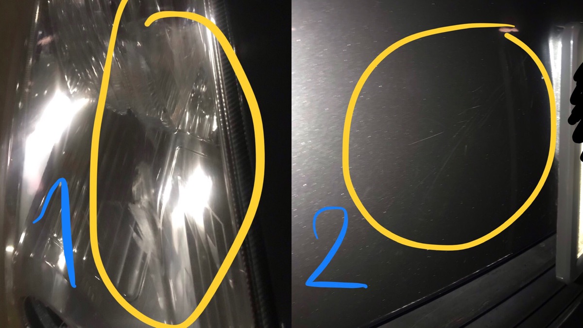 ยังไม่เคยขับชนอะไรเลยครับ แต่ไม่นานตอนจอดรถก็เห็นรอย ตามเลข 1 และ 2