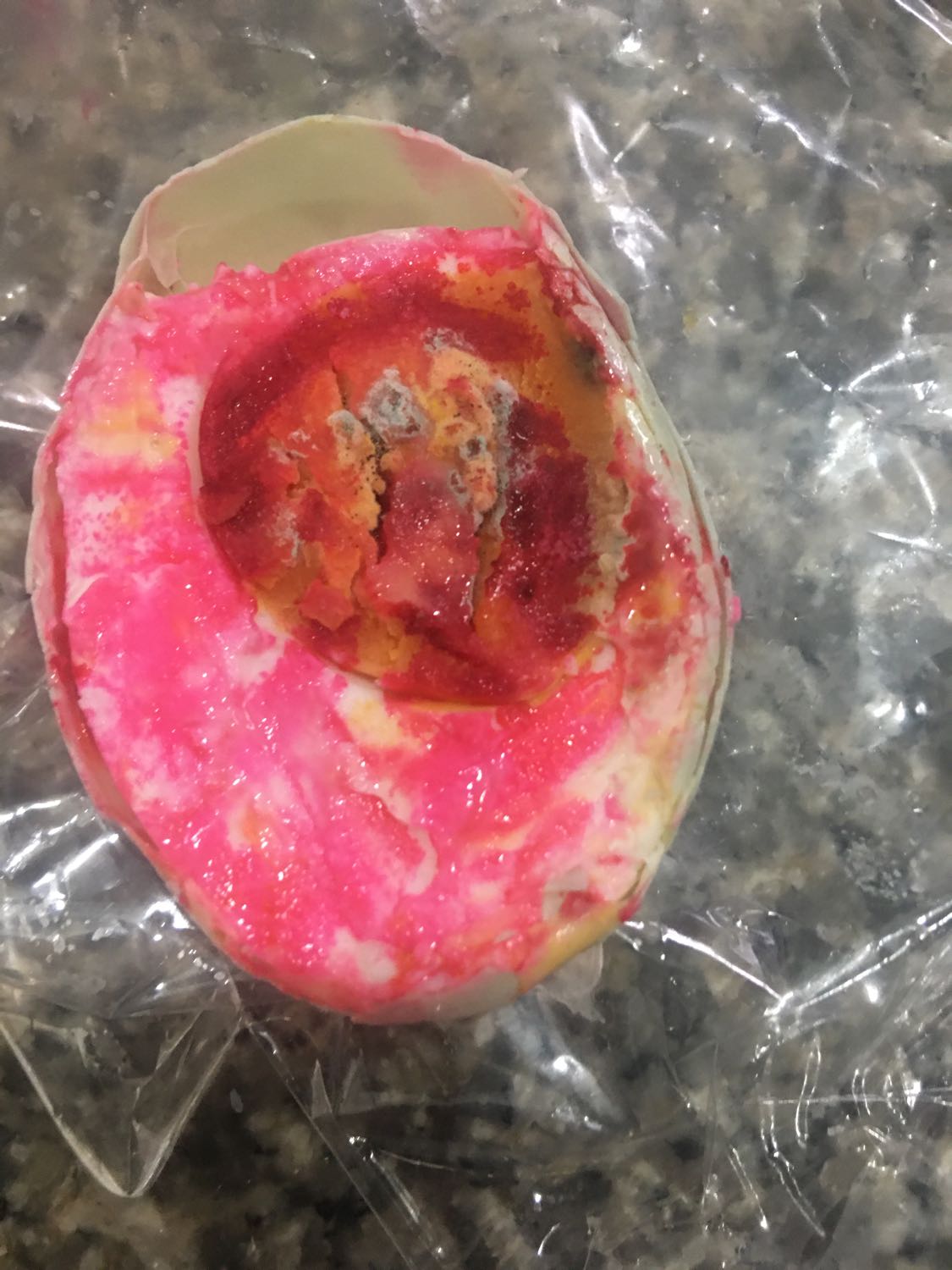 เพิ่งเจอกับตัวเอง ไข่เค็มที่ฝากแม่บ้านซื้อจากตลาดใกล้บ้าน ทานไปครึ่งฟอง เหลือครึ่งฟองใส่ถุงพลาสติกแช่ตู้เย็น ผ่านไปสองวัน สภาพเป็นแบบนี้ คือ ฉีดสีแน่นอน สีที่ฉีดมันเลอะออกมา สีแดงคนละแดงกับสีไข่แดงจริงๆ