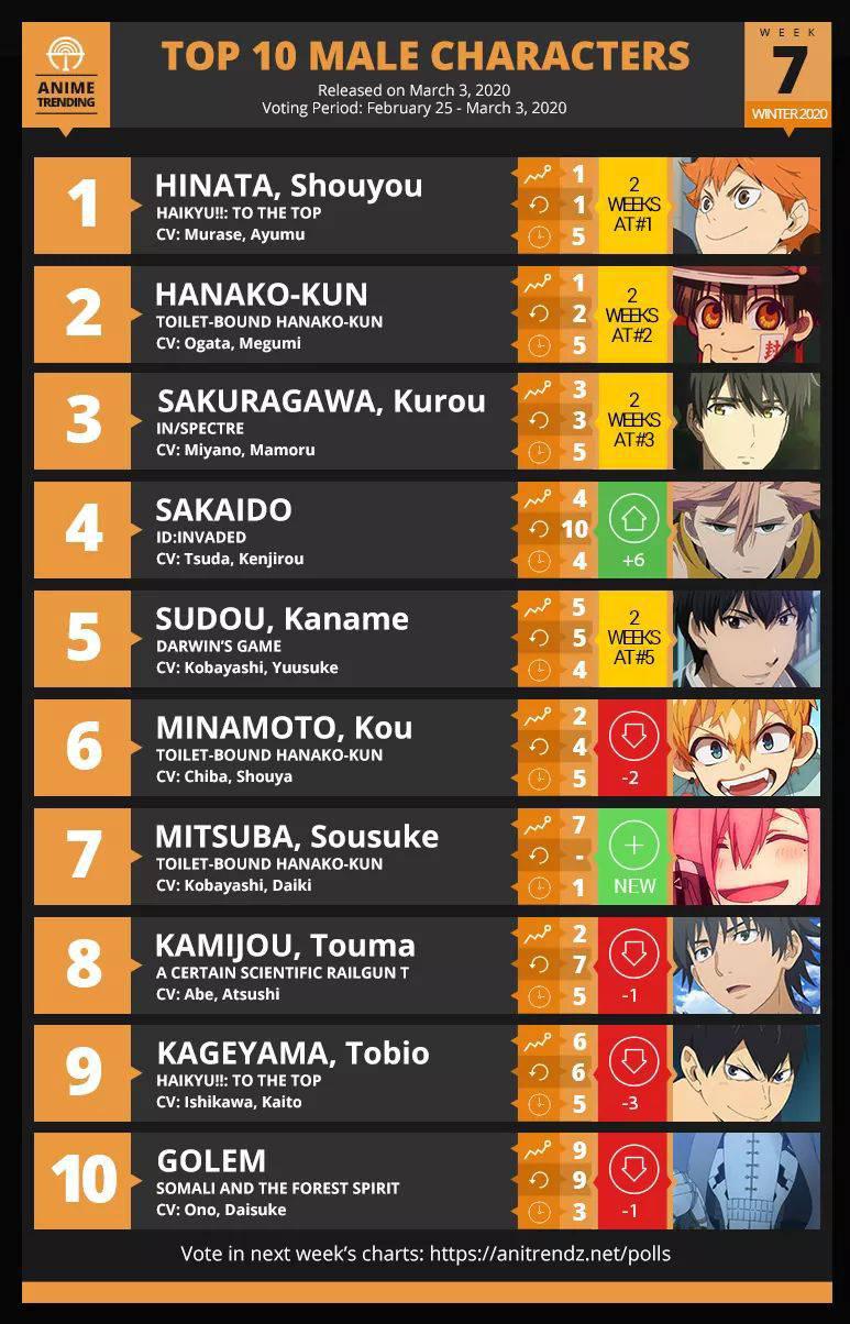 อันดับอนิเมะมาแล้วค่ะ ฮานาโกะคุงกลับมายึดที่หนึ่งคืนแล้ว อันดับตัวละคร ชาย-หญิง เปิดให้โหวตแล้วนะคะ มาโหวตกันค่ะ อันดับฝั่งตัวละครสัปดาห์แรกค่ะ หญิง ชาย และอันดับ OP ED ค่ะ มาโหว