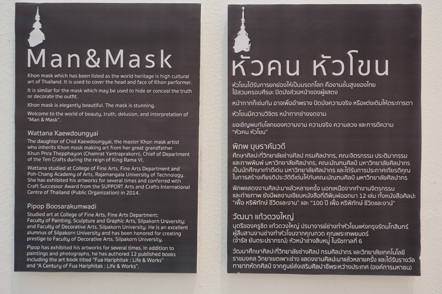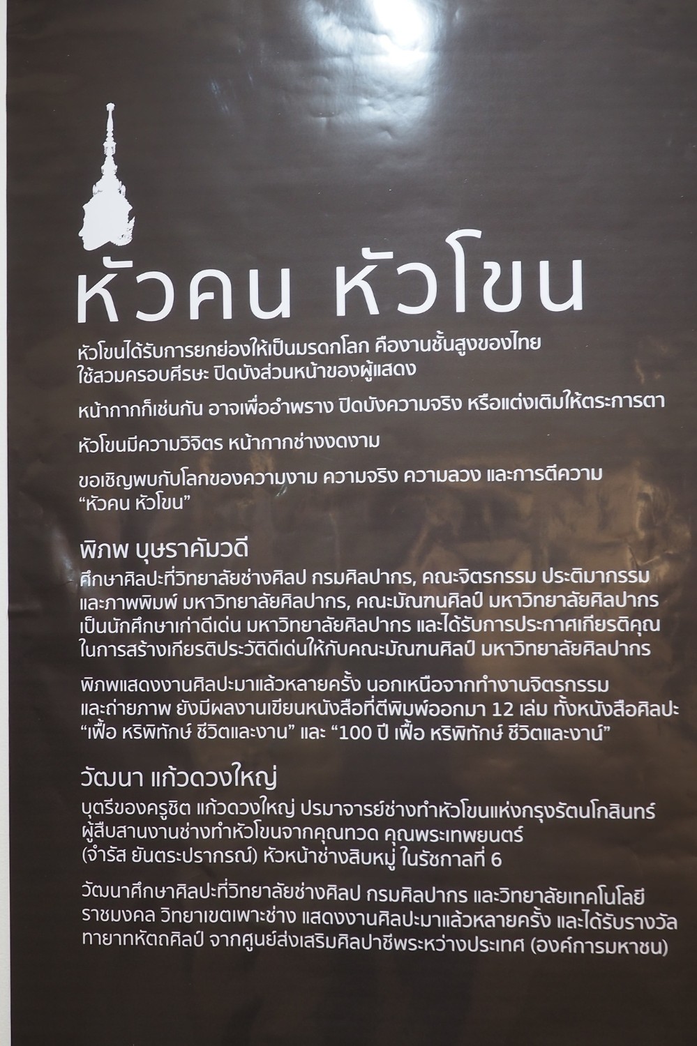 หัวโขนได้รับการยกย่องให้เป็นมรดกโลก คืองานชั้นสูงของไทย ใช้สวมครอบศีรษะ ปิดบังส่วนหน้าของผู้แสดง หน้ากากก็เช่นกัน อาจเพื่ออำพราง ปิดบังความจริง หรือแต่งเติมให้ตระการตา หัวโขนมีความวิจิตร หน้ากากช่างงดงาม ขอเชิญพบกับโลกของความงาม ความจริง ความลวง และการตีความ “หัวคน หัวโขน”