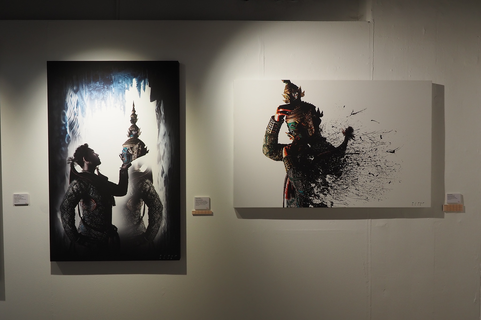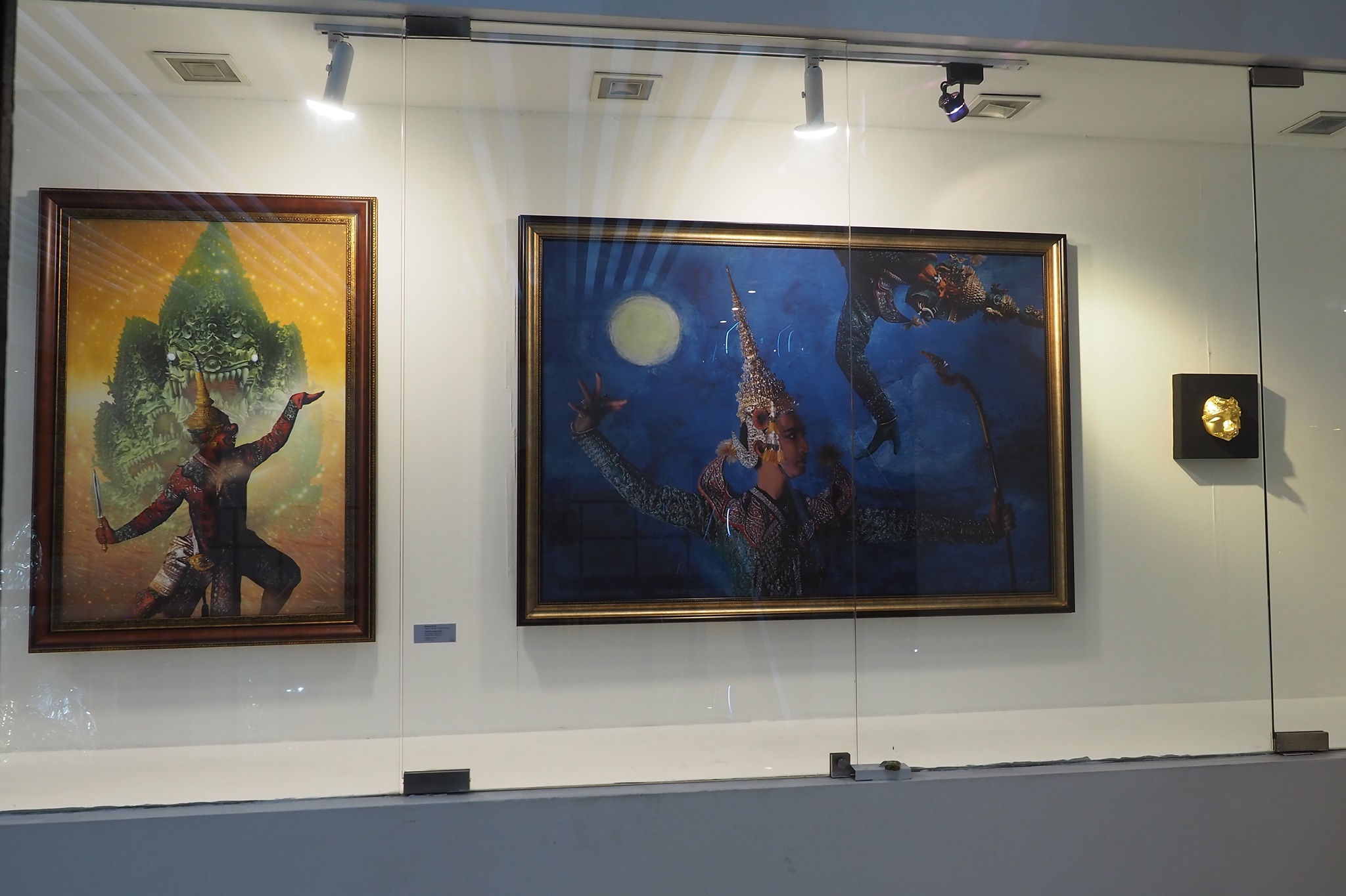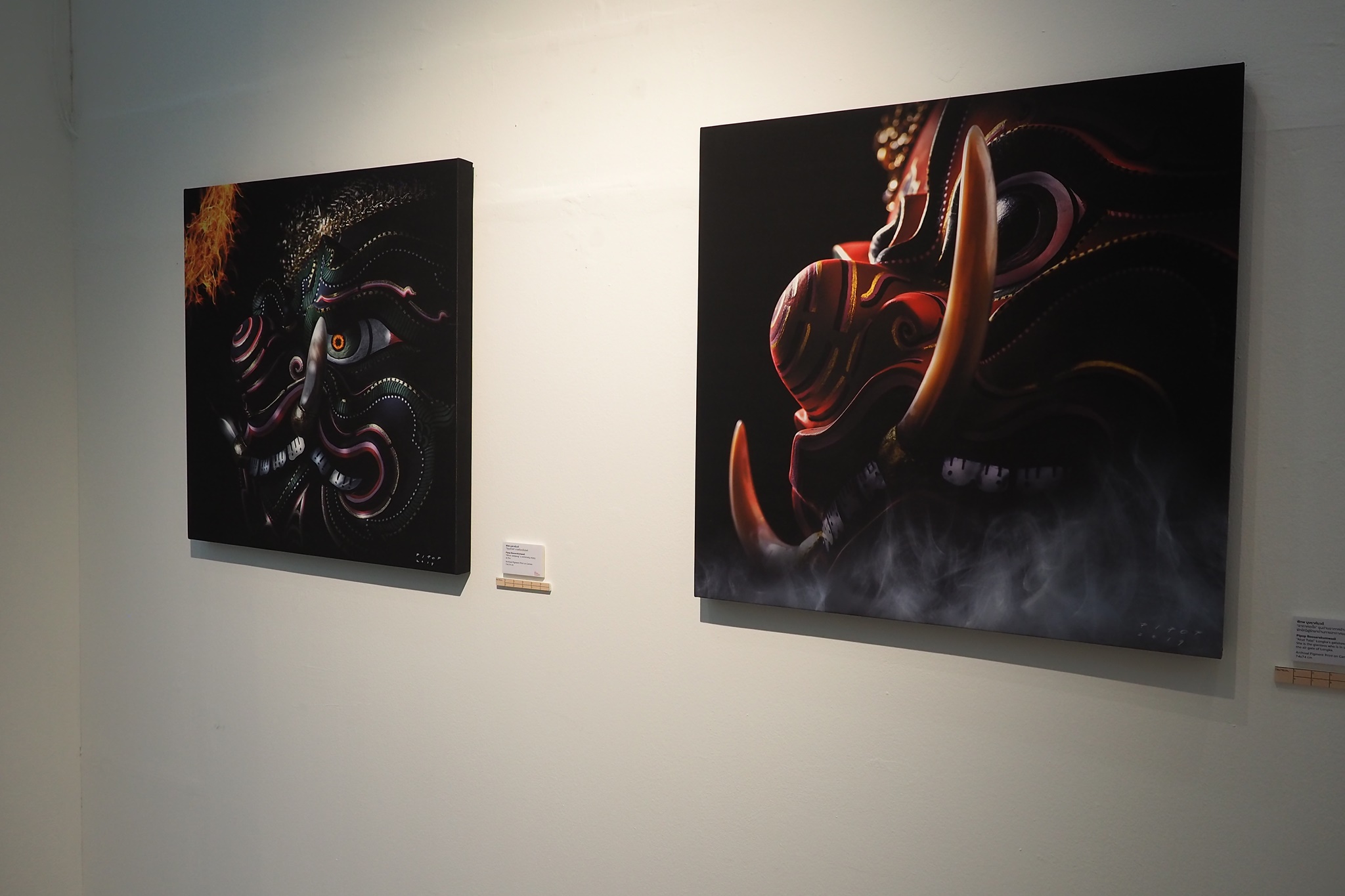 ส่วนภาพที่ผมเห็นผู้มาชมงานชอบกันมากเป็นพิเศษ โดยผมดูจากโปสเตอร์ที่แจกให้ผู้เข้าชมงานเลือกหยิบคนละหนึ่งใบ ตอนที่ลงทะเบียนเข้าร่วมพิธีเปิดงานฯ ผมดูแล้วภาพที่ชื่อว่า “ธรรมะ อธรรม” ที่ในภาพแถวบนเป็นทีมของพระรามและแถวล่างเป็นทีมของทศกัณฐ์นั้น โปสเตอร์ภาพนี้ถูกหยิบเยอะกว่าใบอื่นเลย แล้วแต่ละท่านที่หยิบโปสเตอร์ใบนี้ไปก็ยืนชูโปสเตอร์ถ่ายภาพตัวเองกับภาพของจริงที่โชว์อยู่ในกระจกด้านหลัง ผมเห็นถ่ายภาพกันอย่างนี้หลายท่านหลายกลุ่มเลยครับ สำหรับภาพนี้ผมดูแล้วก็ยังแอบสงสัยเหมือนกันว่าอาจารย์พิภพท่านใช้เทคนิคอะไรในการสร้างสรรค์ภาพนี้? ท่านต้องลองไปชมของจริงดูเองครับ