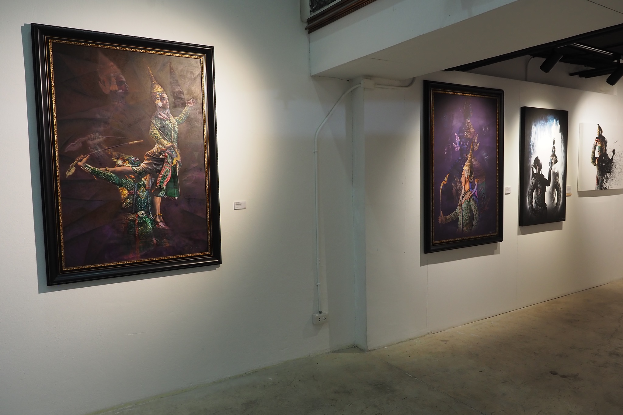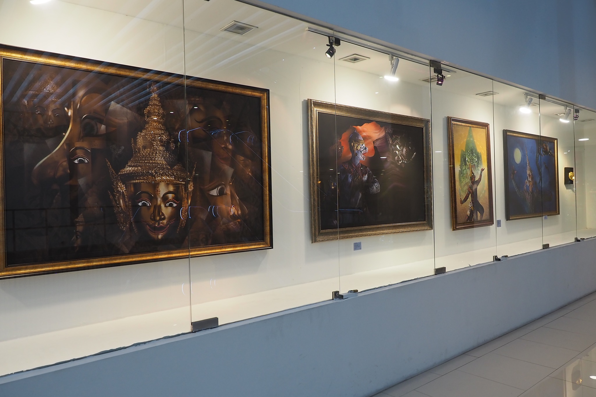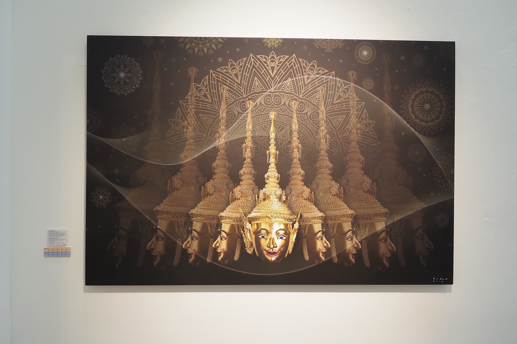 ส่วนภาพที่ผมเห็นผู้มาชมงานชอบกันมากเป็นพิเศษ โดยผมดูจากโปสเตอร์ที่แจกให้ผู้เข้าชมงานเลือกหยิบคนละหนึ่งใบ ตอนที่ลงทะเบียนเข้าร่วมพิธีเปิดงานฯ ผมดูแล้วภาพที่ชื่อว่า “ธรรมะ อธรรม” ที่ในภาพแถวบนเป็นทีมของพระรามและแถวล่างเป็นทีมของทศกัณฐ์นั้น โปสเตอร์ภาพนี้ถูกหยิบเยอะกว่าใบอื่นเลย แล้วแต่ละท่านที่หยิบโปสเตอร์ใบนี้ไปก็ยืนชูโปสเตอร์ถ่ายภาพตัวเองกับภาพของจริงที่โชว์อยู่ในกระจกด้านหลัง ผมเห็นถ่ายภาพกันอย่างนี้หลายท่านหลายกลุ่มเลยครับ สำหรับภาพนี้ผมดูแล้วก็ยังแอบสงสัยเหมือนกันว่าอาจารย์พิภพท่านใช้เทคนิคอะไรในการสร้างสรรค์ภาพนี้? ท่านต้องลองไปชมของจริงดูเองครับ