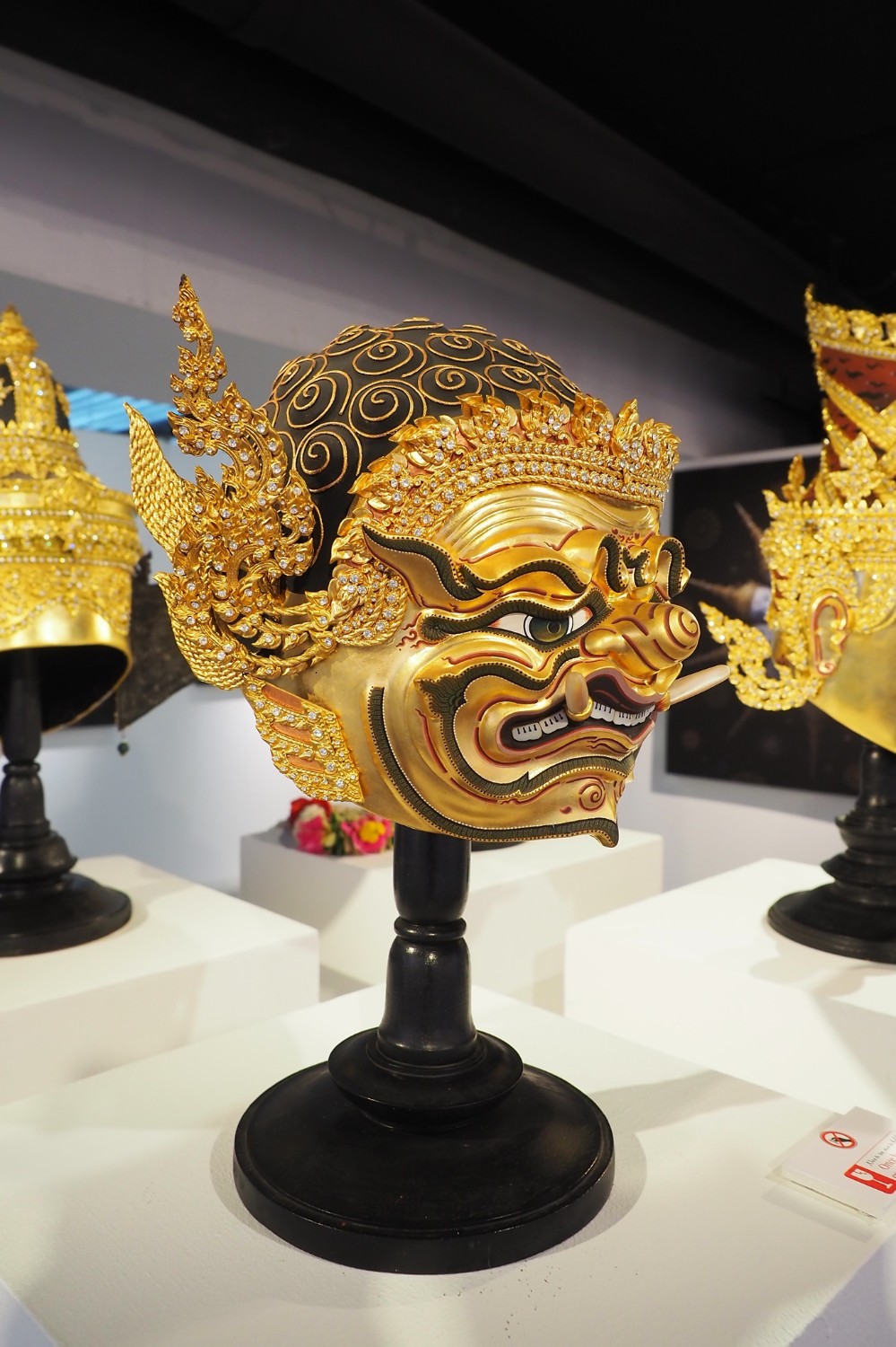 แต่ส่วนตัวแล้วผมกลับชอบผลงานหน้ากากของอาจารย์หน่อยมากกว่าครับ เพราะถ้าให้ผมสมมุติว่าตัวเองอยากจะซื้องานศิลปะไปวางประดับบ้าน ผมคงอยากซื้อผลงานหน้ากากมากกว่าครับ เพราะบ้านของผมต่ำต้อยและอาจจะไม่คู่ควรพอที่มีหัวโขนตั้งอยู่ก็เป็นได้ ยิ่งเป็นหัวโขนสีทองที่ดูแล้วขลังเหมือนลงจิตวิญญาณของช่างผู้ทำไว้ด้วย ตัวผมขอแค่เพียงได้ชมได้พินิจด้วยตาก็เป็นบุญแก่ใจผมแล้วครับ ซึ่งอาจจะเป็นแค่ความคิดส่วนตัวของผมในความรู้สึกชั่วขณะหนึ่งที่ผมได้ชมงานเท่านั้นเองครับ