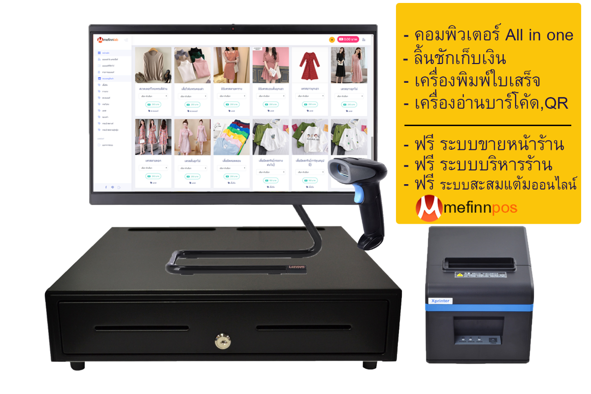 ชุดแนะนำ พร้อมเปิดร้าน ประกอบไปด้วย 1. All-in-One PC 1 เครื่อง + เมาส์ + คีย์บอร์ด 2. ลิ้นชักเก็บเงิน 1 เครื่อง 3. เครื่องพิมพ์ใบเสร็จ 80 มม. (USB) 1 เครื่อง 4. เครื่องอ่านบาร์โค้ด 1 เครื่อง 5. ระบบ mefinnPOS อายุการใช้งาน 1 ปี 6. แถมฟรี กระดาษพิมพ์ใบเสร็จ 2 ม้วน