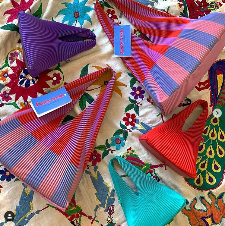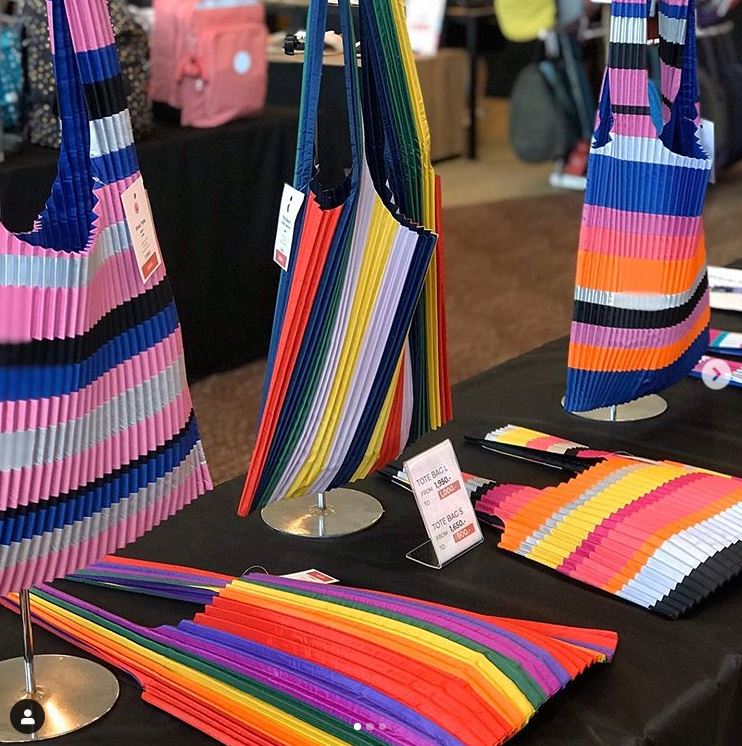 กระเป๋าผ้าพลีท ทรงไม่เหมือนแบรนด์อื่นๆ ทรงจะออกคล้ายสามเหลี่ยม ดูมีดีไซส์เป็นของตัวเอง สีสันสดใสม๊าก สาวแฟชั่นห้ามพลาดเลย เป็นลายทางสกรีนสีสันสดใสหรือตัวอักษรเท่ ๆ หรือจะเป็นสีพื้นเรียบๆก็มีนะ