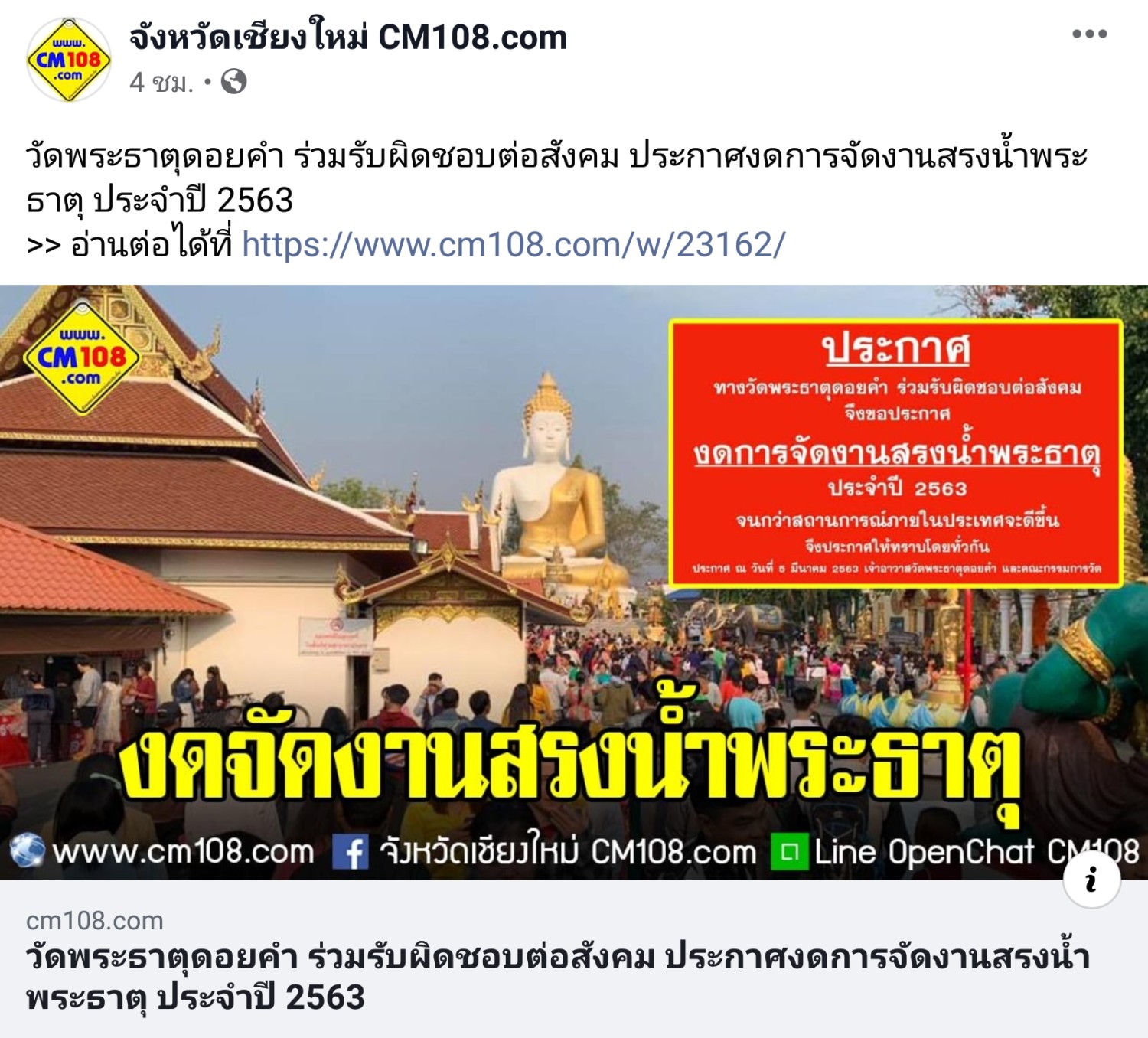 วัดพระธาตุดอยคำร่วมรับผิดชอบต่อสังคม กรณีไวรัส covid19 งดจัดงานสรงน้ำพระธาตุประจำปี 2563