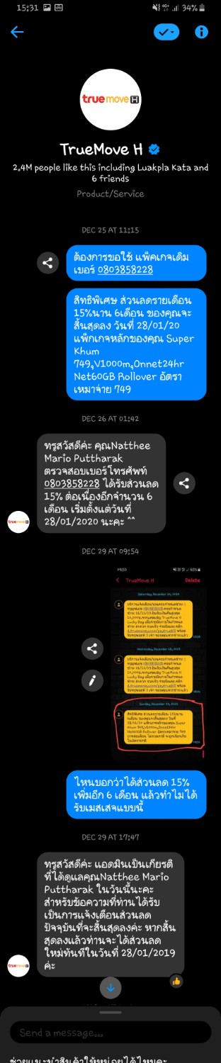 เมื่อปลายเดือนธันวาคม 62 ติดต่อทางเพจเฟสบุ๊ก True Move H ทาง ib ได้รับคำตอบว่าจะได้รับส่วนลดต่อเนื่องอีก 6 เดือน แต่พอบิลค่าโทรเดือนกุมภาพันธ์ 63 มา กลับไม่ได้รับส่วนลด โทรหาเจ้าหน้าที่ดูแลสิทธิ์ก็บอกว่าให้ไม่ได้ เจ้าหน้าที่ในเพจอาจผิดพลาด แบบนี้ลูกค้าต้องรับผิดชอบเองเหรอ 😡