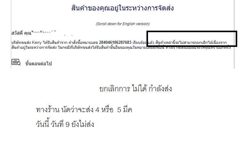 บอกว่า ยก เลิก การสั่งซื้อไม่ ได้ ต้อง ให้ ของมาส่ง เเล้ว เเจ้ง กับคนส่งว่าไม่รับของ เพราะ ส่งของ ช้ามาก