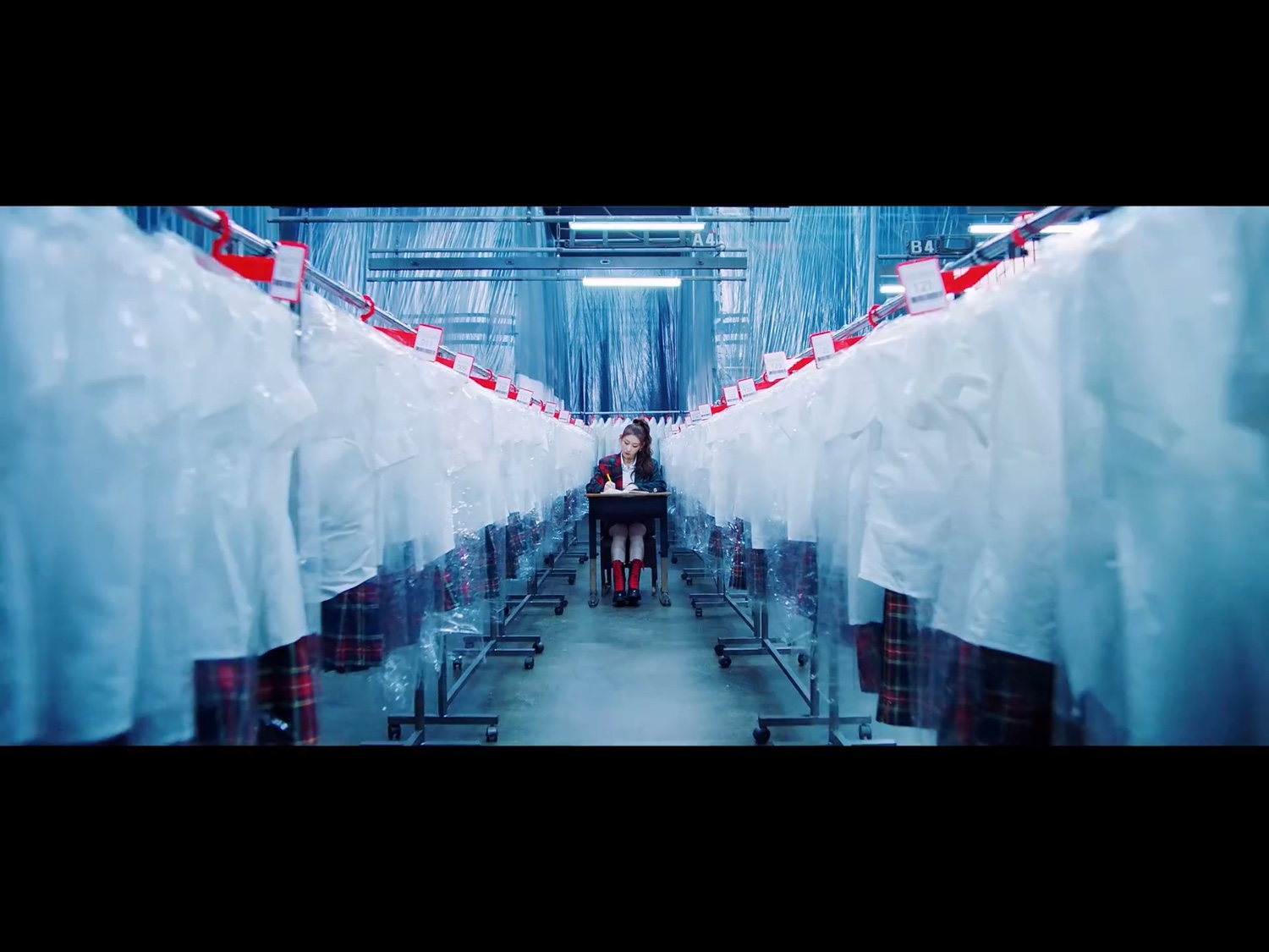 มาที่แชรยอง ดูเหมือนกำลังนั่งเรียน และถูกล้อมรอบไปด้วยชุดนักเรียน หรือนี่อาจเป็น “กรอบทางการศึกษา” มีด้วยหรอ? มีค่ะ “ตั้งใจเรียนสิ จะได้เรียนสูงๆ จบมามีงานดีๆทำ” เห็นกรอบรึยังคะ? บางทีสิ่งนี้ก็เป็นอีกส่วนนึงที่ทำให้เราไม่เป็นตัวของตัวเอง