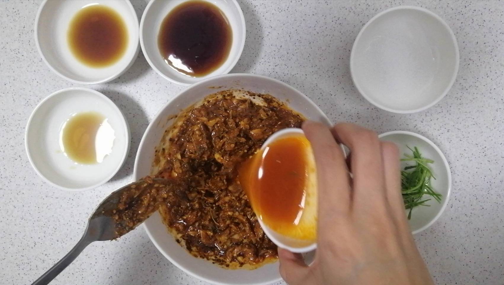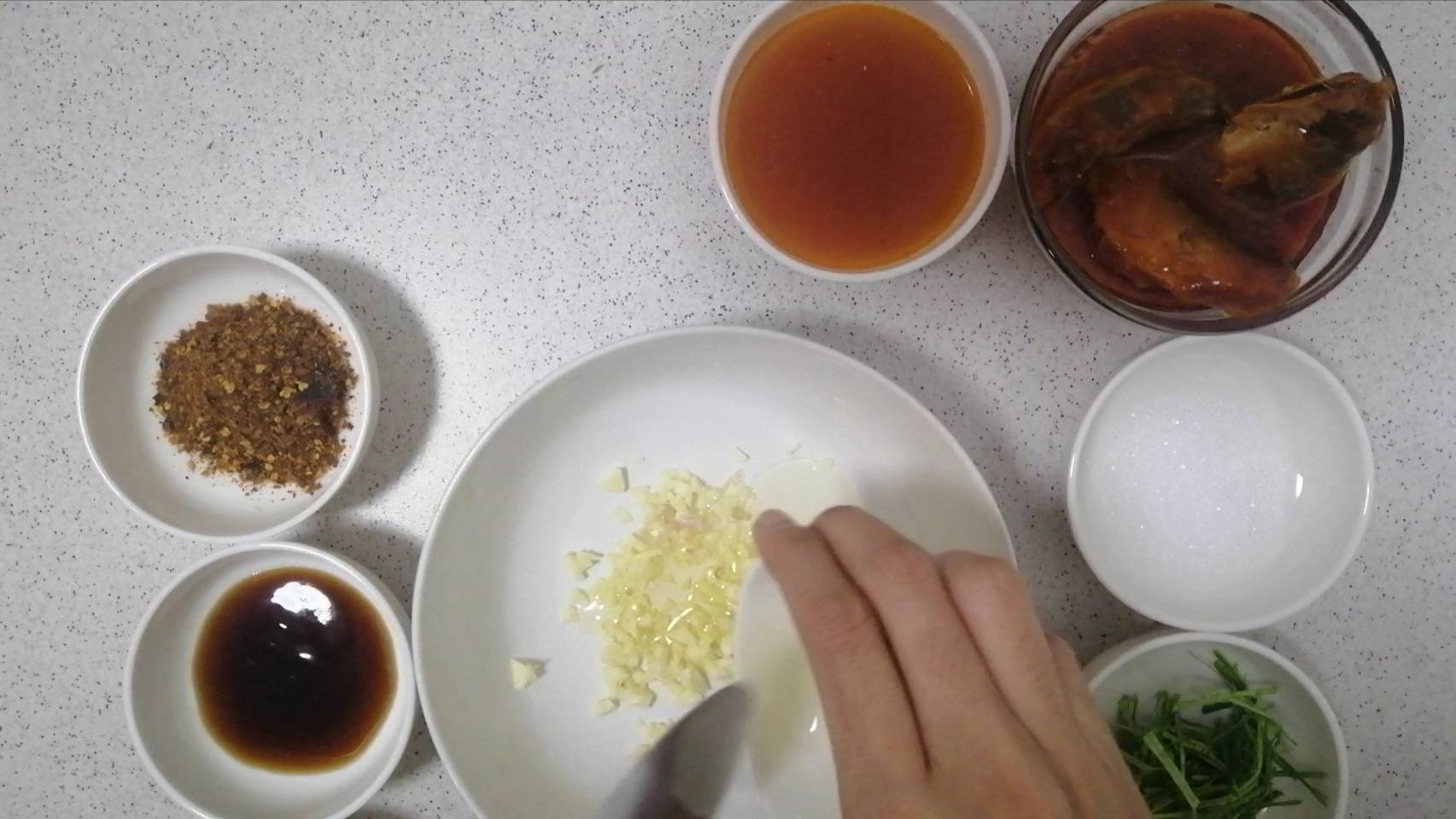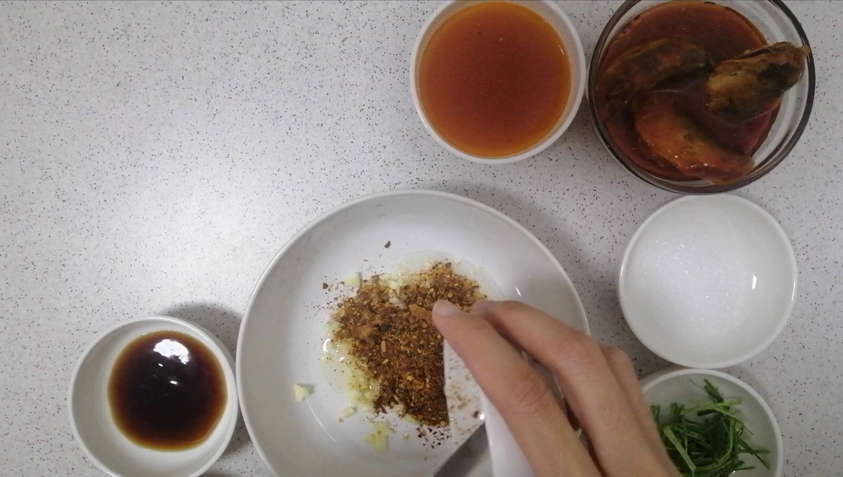 ขั้นตอนแรกให้นำกระเทียมสับ น้ำมันพืช และพริกป่น ใส่ภาชนะที่สามารถเข้าไมโครเวฟได้ คนคลุกเคล้าให้เข้ากัน แล้วนำไปเข้าไมโครเวฟที่ไฟปานกลาง 1 นาที