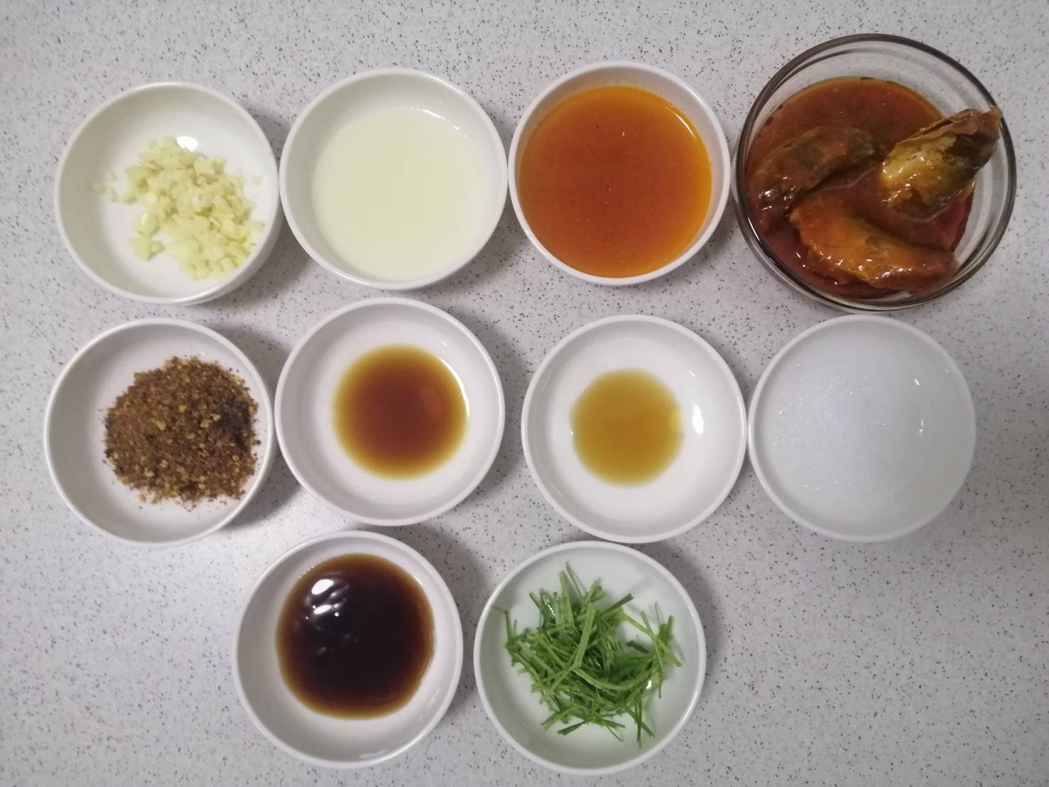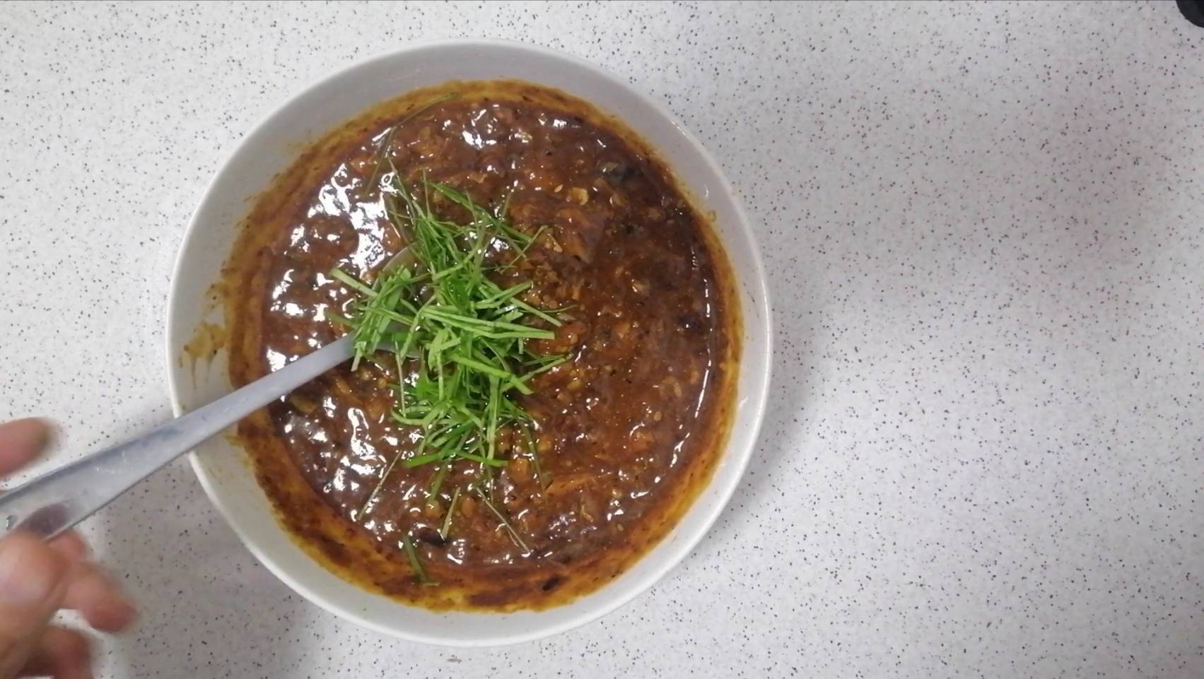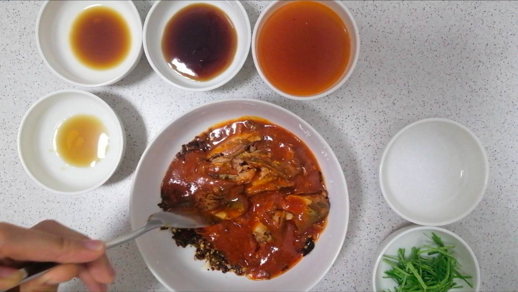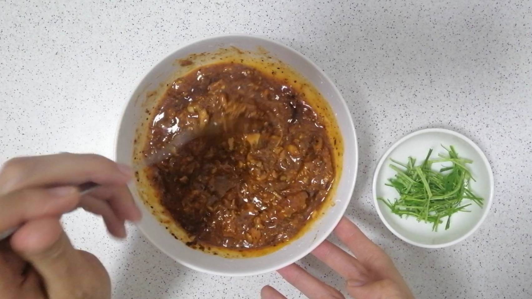 ขั้นตอนแรกให้นำกระเทียมสับ น้ำมันพืช และพริกป่น ใส่ภาชนะที่สามารถเข้าไมโครเวฟได้ คนคลุกเคล้าให้เข้ากัน แล้วนำไปเข้าไมโครเวฟที่ไฟปานกลาง 1 นาที