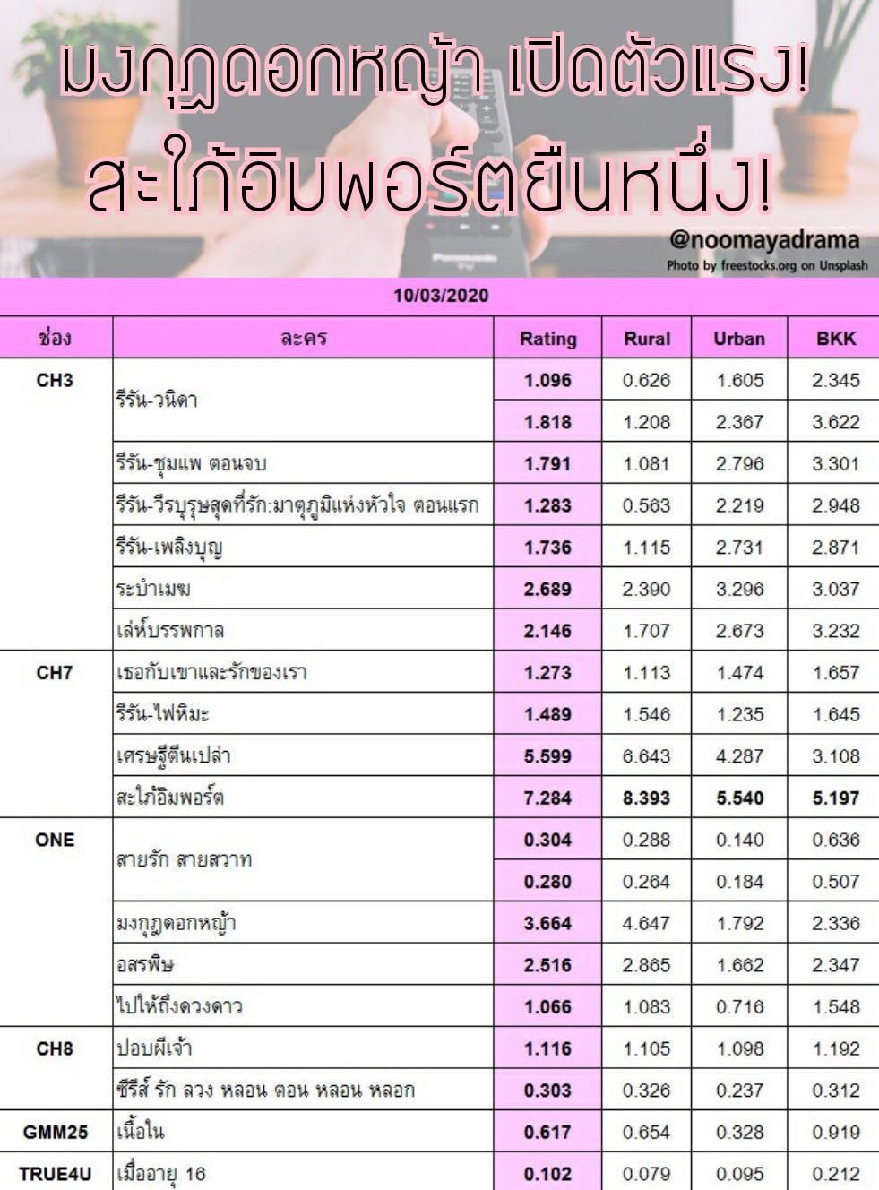 เรตติ้งละคร 10.03.64 ทุกช่องจาก คุณหนูมายา