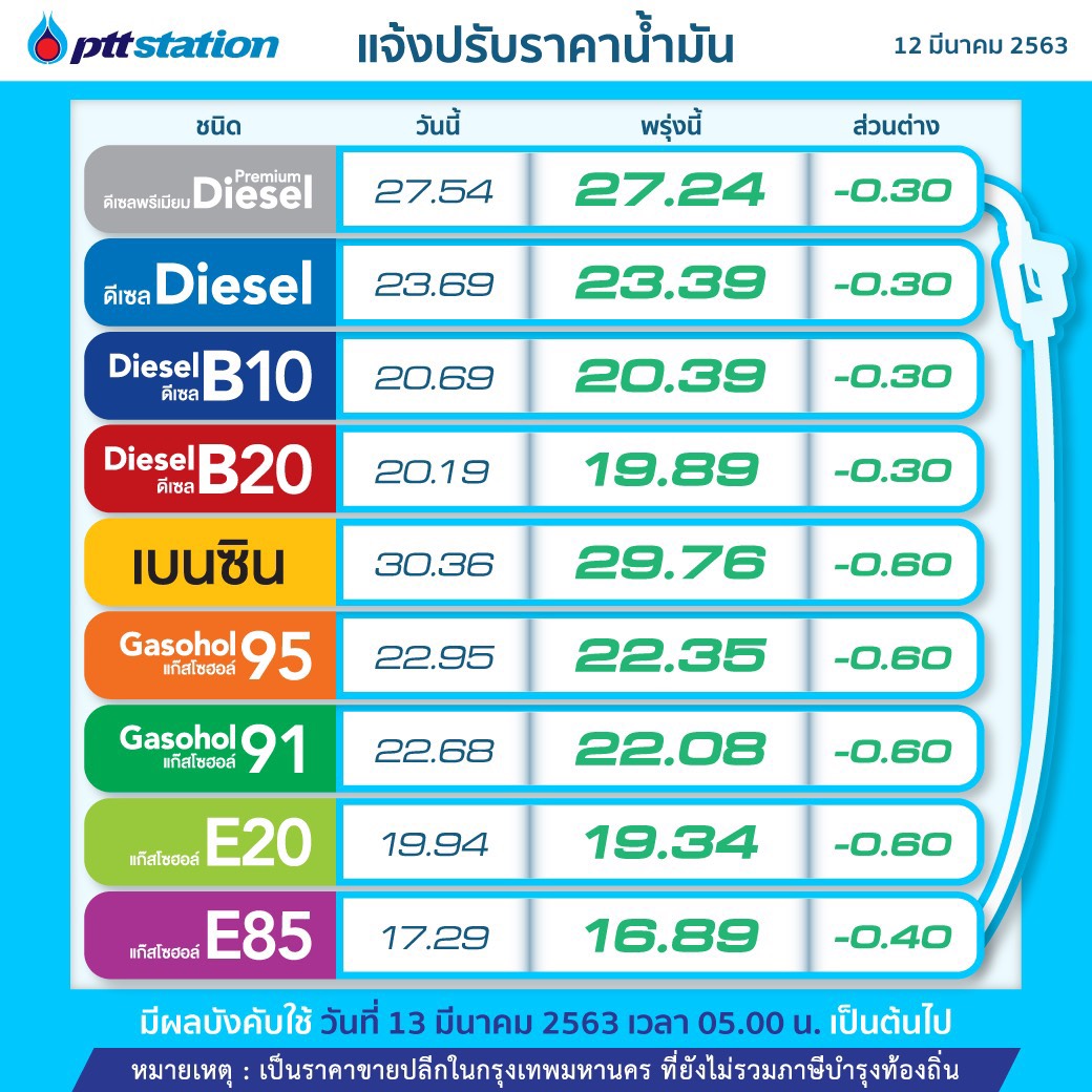 40 สตางค์ ส่วนกลุ่มดีเซล ลดลง 30 สตางค์ มีผล 13 มี.ค.2563 เวลา 05.00 น. เป็นต้นไป ส่งผลให้ราคาขายปลีกใหม่จะเป็นดังนี้ น้ำมันเบนซิน 95 อยู่ที่ 29.76 บาทต่อลิตร, แก๊สโซฮอล์ 95 อยู่ที่ 22.35 บาทต่อลิตร, น้ำมันแก๊สโซฮอล์ อี20 อยู่ที่ 19.34 บาทต่อลิตร, แก๊สโซฮอล์ 91 อยู่ที่ 22.08 บาทต่อลิตร, แก๊สโซฮอล์ อี85 อยู่ที่ 16.89 บาทต่อลิตร, ดีเซล อยู่ที่ 23.39 บาทต่อลิตร, บี10 อยู่ที่ 20.39 บาทต่อลิตร และบี20 อยู่ที่ 19.89 บาทต่อลิตรโดยราคาขายปลีกข้างต้นยังไม่รวมภาษีบำรุงกรุงเทพฯ