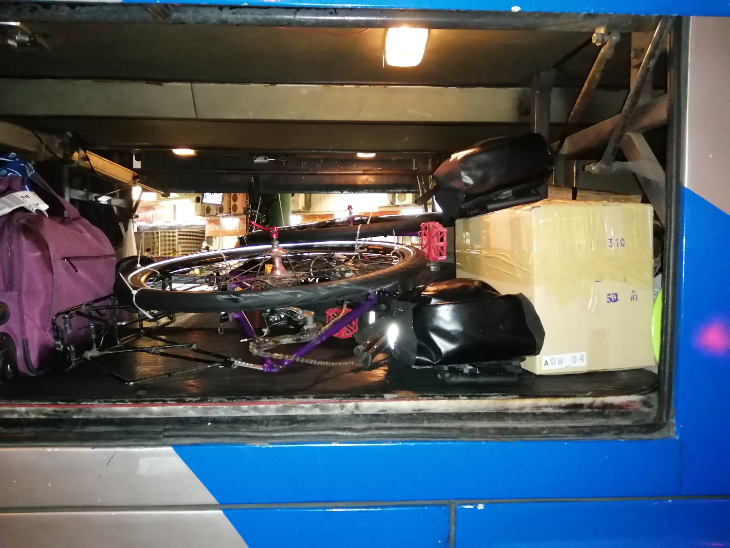 คืนวันที่ 14 ก.พ 63 ประมาณ 20.00 น. ณ สถานีขนส่งรถโดยสาร บขส. ท่าอากาศยานสุวรรณภูมิ ผมเดินทางโดยรถทัวร์ บขส. โดยรถจะออกเวลา 21.00 น. ผมมาก่อนเวลา 1 ชม. นำจักรยานถอดล้อ 2 ข้างออก แล้วมัดรวมกับตัวเฟรมเพื่อสะดวกในการเอาไปเก็บที่ห้องสัมภาระใต้ท้องรถทัวร์ โดยเสียค่าขนส่ง 200 บาท อันนี้เสียให้กับ คนขับรถนะครับ พิเศษให้เขาไป เวลาประมาณ 21.00 น. รถก็ออกครับ