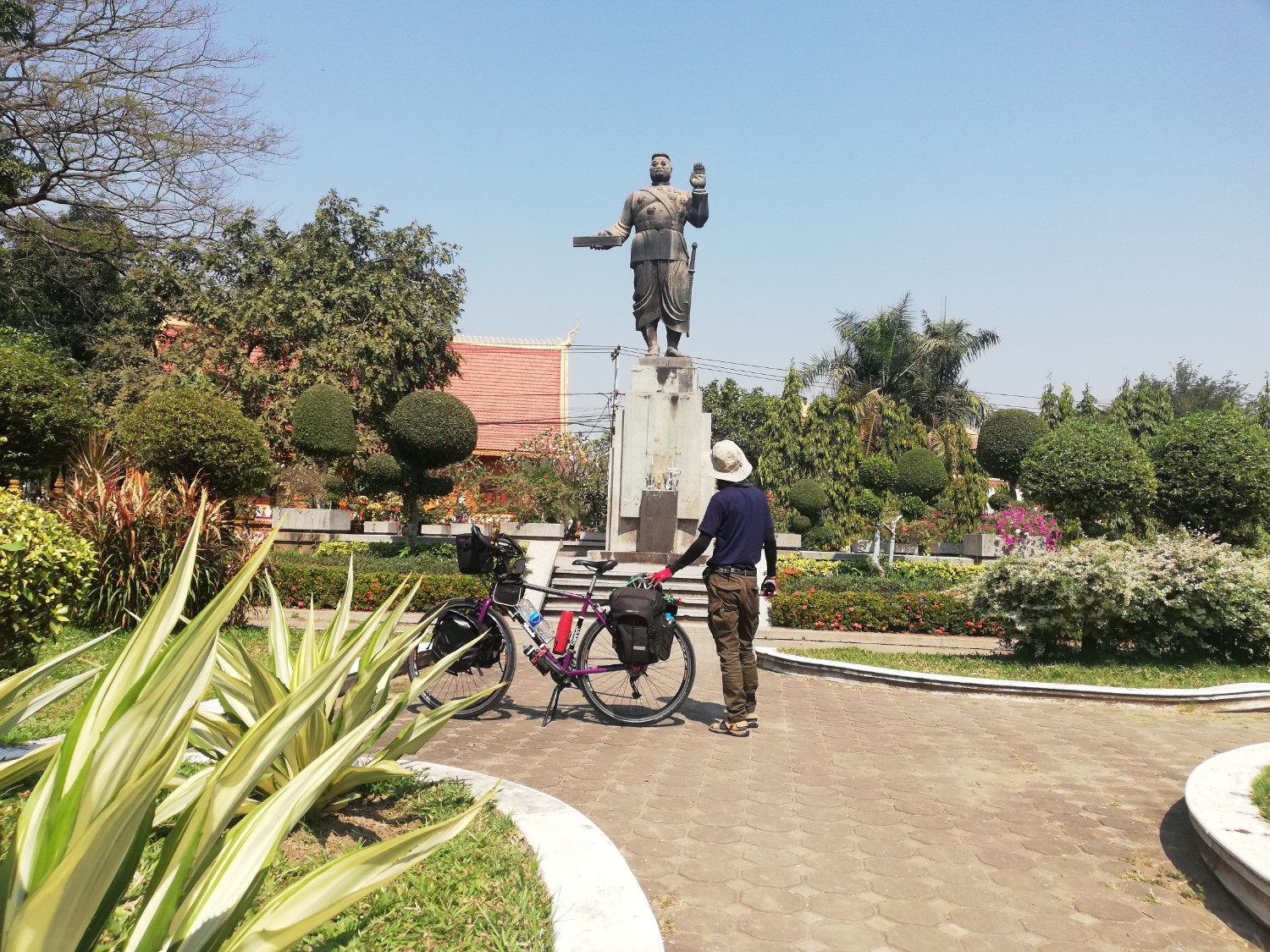 ประมาณ 11:00 น. ผมก็ปั่นมาถึงประตูชัย ผมแวะถ่ายรูปเพื่อเป็นที่ระลึกก่อนที่จะรีบปั่นออกนอกเมืองไปยังถนนหมายเลข 13 ซึ่งเป็นถนนเส้นทางสายเหนือ ที่จะไปวังเวียง หลวงพระบาง