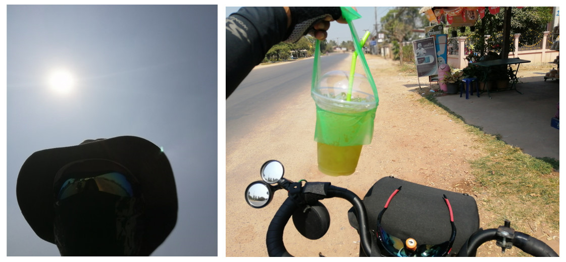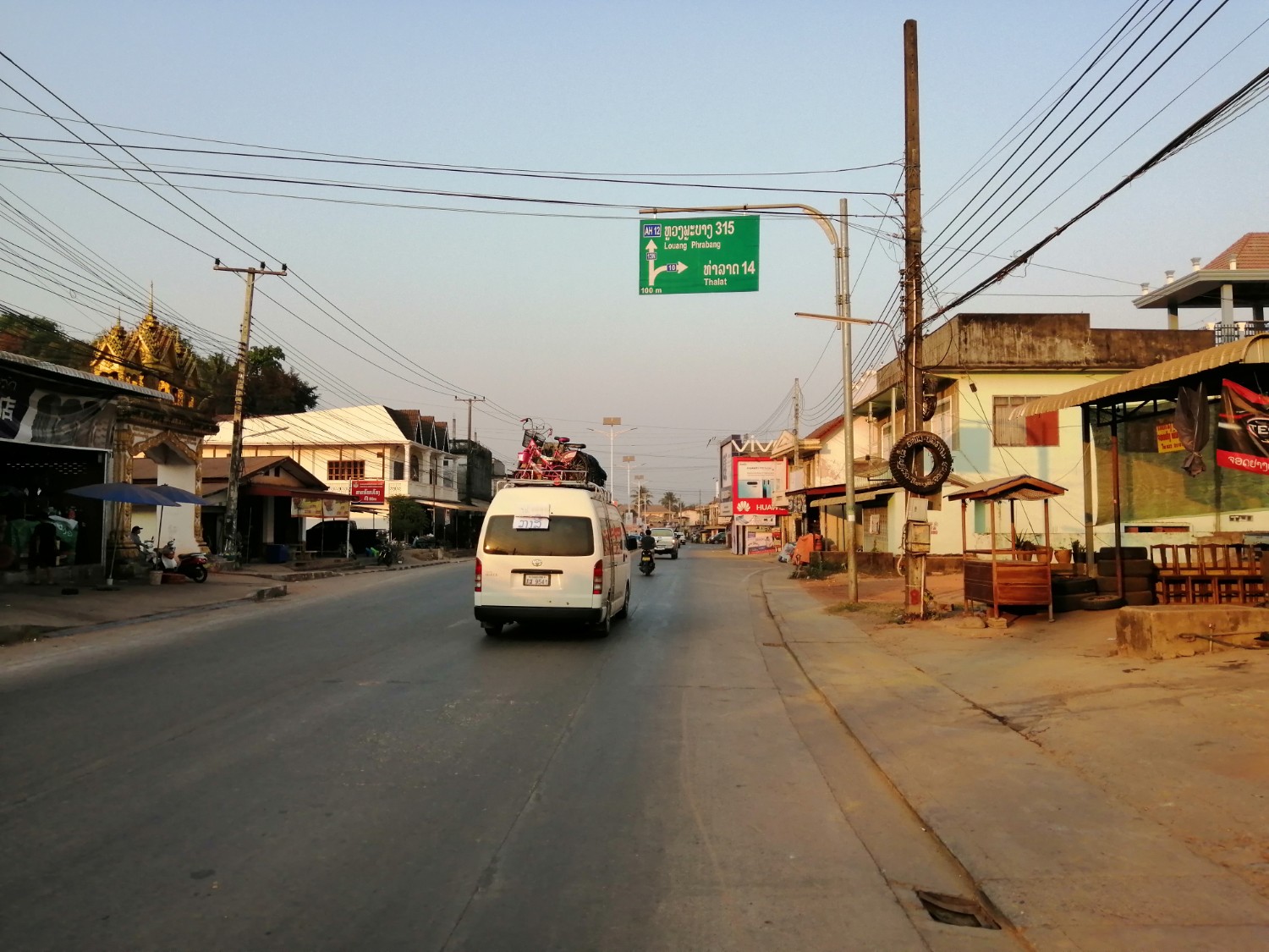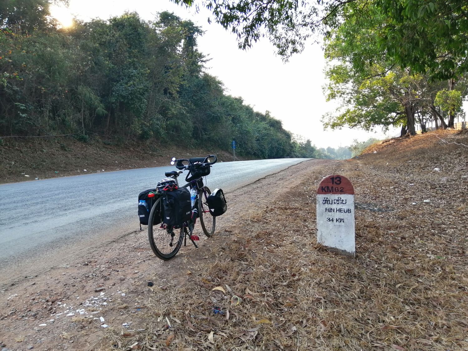 ถนนหมายเลข 13 ที่ออกจากเวียงจันทร์แรกๆ การจราจรยังพลุกพล่าน ตรงนี้ต้องมีสติในการปั่นครับ เพราะว่าถนนมันค่อนข้างแคบ โดยเฉพาะข้างๆ ทางจะเป็นหลุมเยอะ แล้วตรงไหนเป็นแหล่งชุมชนหรือตลาด จะมีรถจอดตลอดข้างทางกันเยอะ ทำให้ ผมต้องปั่นด้วยความระมัดระวัง ผมจะไม่ปั่นออกมา ตรงกลางถนนเท่าไรนัก ปั่นชิดริมทางอย่างเดียว บางทีก็ยอมตกหลุม ให้สะเทือนจักรยานดีกว่าเข้าไปอยู่ในเลนที่มีรถรากับวิ่งกันเพ่นพล่าน และผมยังไม่รู้วัฒนธรรมการขับรถในบ้านเขา ว่าขับรถกันอย่างไร ผมเลยต้องเลือกที่จะหลบไว้ก่อนครับ