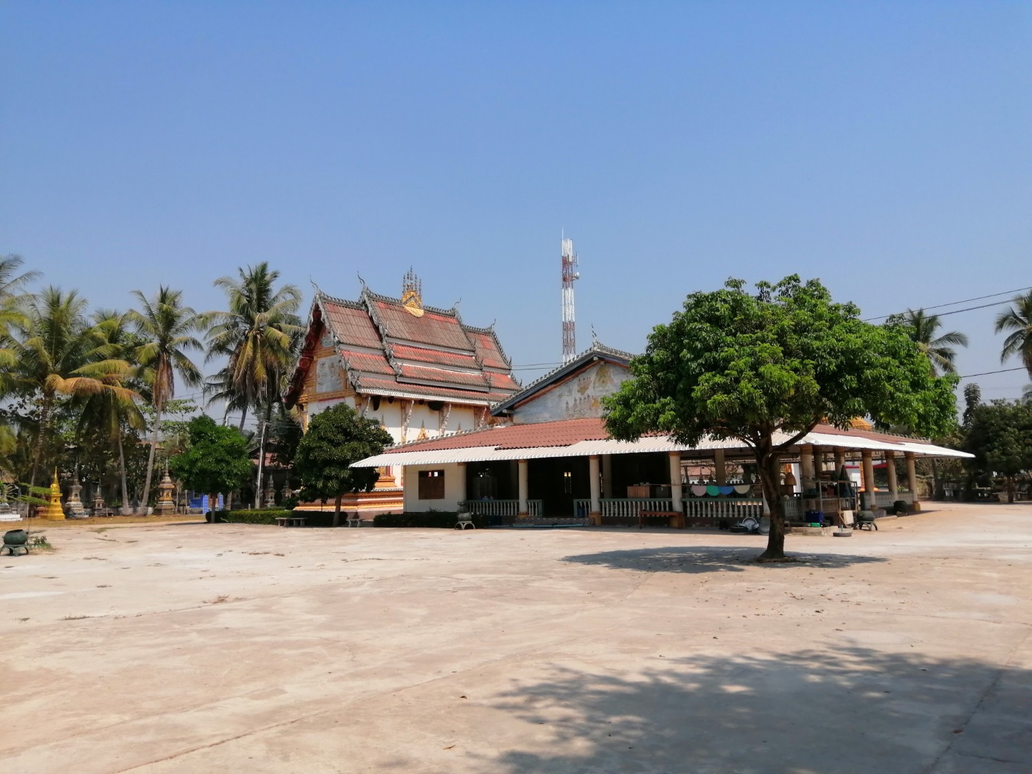 ปั่นมาได้ครึ่งทางแล้ว รู้สึกว่าผมควรต้องหาที่หลบร้อนก่อนดีกว่า ระยะทางเหลืออีก 50 กม.ก็จะถึงบ้านโพนโฮง ยังไงก็ทัน ผมเห็นวัดที่ตั้งอยู่ริมทางชื่อว่าวัดสีสะหวาด ผมแวะเข้าไปทันที โชคดีจริงๆ ที่นี่มีโต๊ะม้าหินอ่อนให้นั่ง ใต้ต้นไม้ มีศาลาหลบร้อน มีห้องน้ำพร้อม “ เสร็จโจรล่ะ ”
