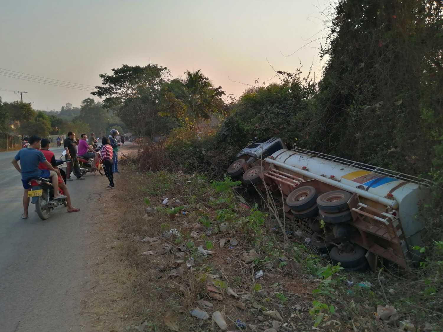 ก่อนถึงบ้านโพนโฮง ระหว่างทางขึ้นเนิน เห็นฝั่งตรงข้ามมีรถบรรทุกน้ำมันเบรคแตกลงมานอนตะแคงอยู่ข้างทาง ผมจอดจักรยานเดินข้ามฝั่งไปดู มีชาวบ้านหลายคนออกมาดู และก็มีป้าคนหนึ่งแกมาถาม “เจ้าเป็นคนขับรถแม่นบ่"...ผมตอบ "บ่บบบ ข้อยถีบรถจักมา จอดอยู่ฝั่งโน้น " 555 เหมือนคนขับรถบรรทุกตรงไหนเนี้ย”