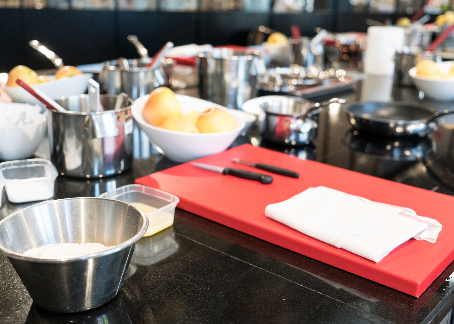 เมื่อเข้าไปในครัว ก็จะเจอกับอุปกรณ์ต่างๆที่จัดเตรียมไว้อย่างครบครัน ภายในหนึ่งคลาสเรียนนั้น จะประกอบไปด้วยผู้เข้าร่วมประมาณ 10-12 คน ซึ่งนับว่าเป็นจำนวนที่พอดี ช่วยให้เชฟสามารถสอนได้ทั่วถึง และเหล่าผู้ร่วมคลาสยังสามารถให้การช่วยเหลือกันได้อีกด้วย เชฟของเราอารมณ์ดีและมีความเป็นกันเอง ระหว่างเรียนก็ไม่ต้องเกร็งและรู้สึกผ่อนคลาย สนุกสนานไปกับการทำอาหาร ด้วยจำนวนคนที่ไม่มาก ขนาดห้องเรียนที่ใหญ่กำลังพอดี เชฟสามารถเข้าไปช่วยอธิบายให้ฟังได้เพิ่มเติม หากดูทีท่าแล้วน่าจะไม่รุ่ง 55555555