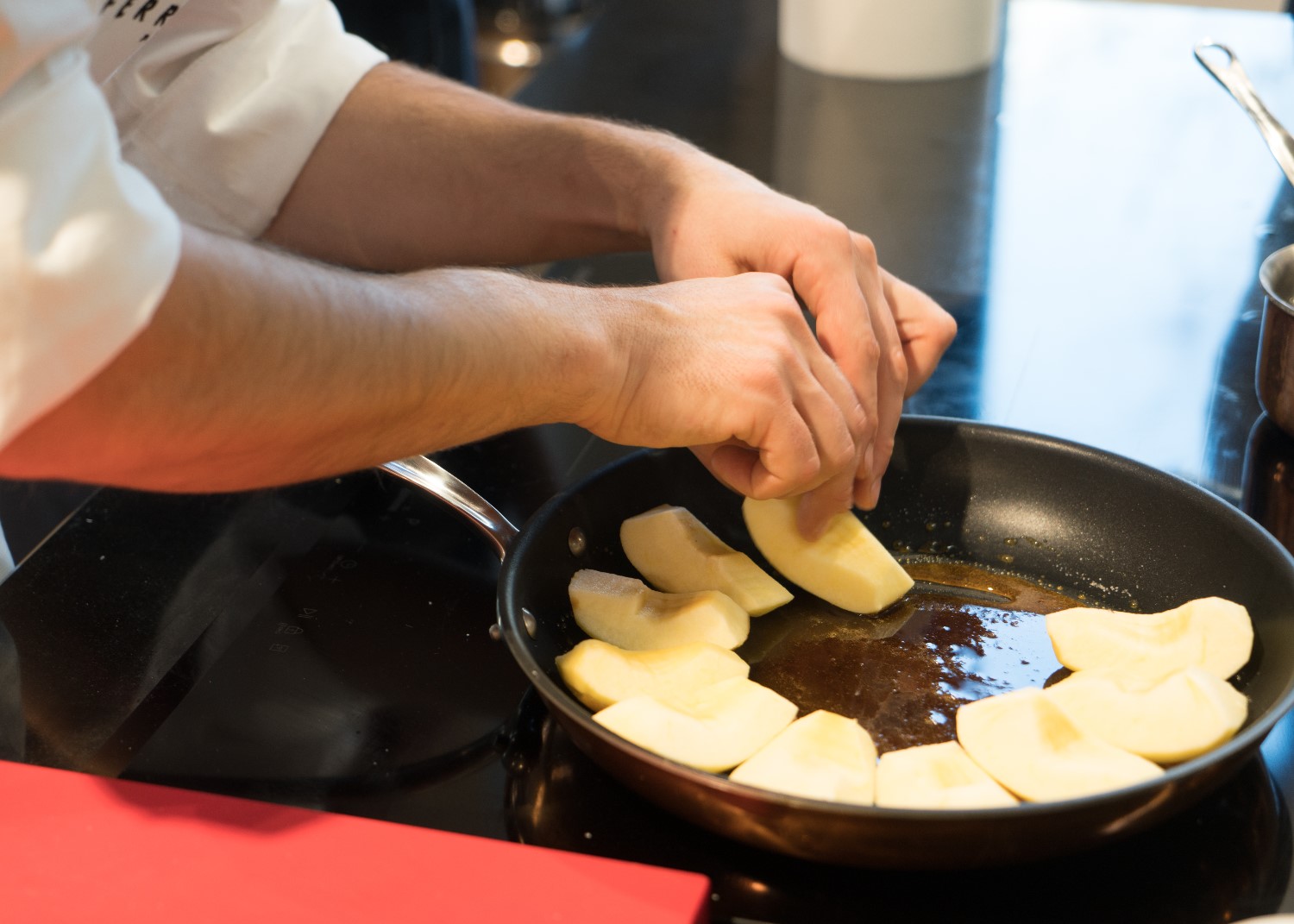 เริ่มต้นคลาสนี้ด้วยการนวดแป้งทาร์ต เเละนำเข้าไปแช่ในตู้เย็นเพื่อให้แป้งเซ็ทตัว หลังจากนั้นก็เริ่มปลอกแอปเปิ้ล และหั่นเป็นชิ้นๆ