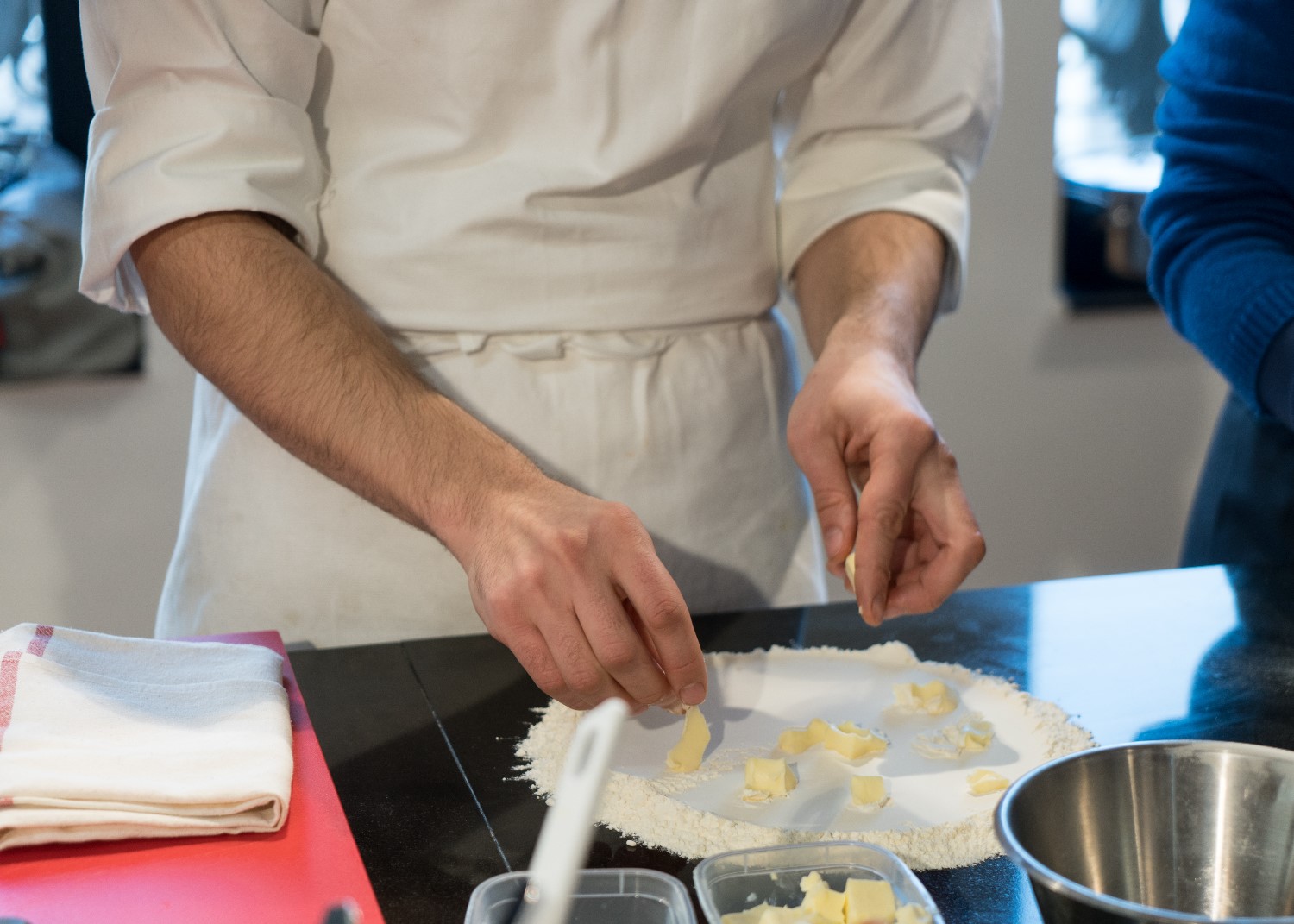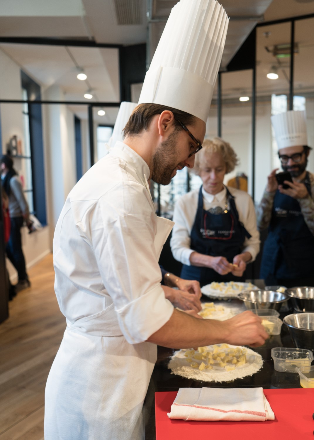 การเข้าไปร่วมเวิร์คช้อปทำอาหารของเราครั้งนี้ ก็ได้รับความสนุกสนานเเละความรู้จากเชฟพาโบล ซึ่งเรียนจบจากโรงเรียนสอนทำอาหาร Ferrandi กิจกรรมนี้จัดขึ้นที่บริเวณชั้น 3 ในห้างสรรพสินค้าแกลอรี่ ลาฟาแยตต์ ตึกเมซง&กูเม่ (Galeries Lafayette Maison & Gourmet) ที่บริเวณทางเข้าสถานที่เวิคช้อปนั้นคุณจะได้รับผ้ากันเปื้อน หมวกสำหรับทำอาหาร อารมณ์แบบมาสเตอร์เชฟ และก็จะเริ่มด้วยการที่เชฟพาโบลเข้ามาให้ความรู้เกี่ยวกับการทำเวิคชอปเบื้องต้น ก่อนที่จะเข้าไปลงมือทำอาหารกันจริงๆ