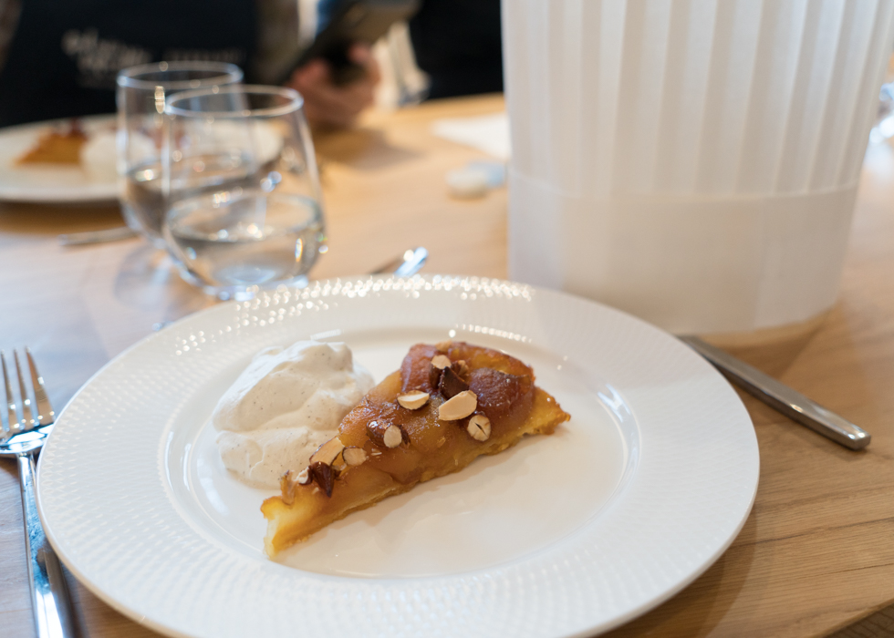 เมื่อได้เวลาวิปครีมเนียนได้ที่ ทาร์ตแอปเปิ้ลสุกพร้อมทาน ทุกคนก็เตรียมตัวพร้อมชิมที่โต๊ะขนาดใหญซึ่งเตรียมไว้สำหรับให้ได้นั่งชิมอาหารและถ่ายรูปกัน รสชาติของทาร์ตแอปเปิ้ล กลิ่นหอมของคาราเมล เรียกได้ว่าเป็นรสชาติขนานแท้แบบฝรั่งเศสที่ยากจะห้ามใจ ทานคู้กับวิปครีมที่เราลงมือตีด้วยตัวเอง มื้อนี้ประทับใจสุดๆ นับว่าเป็นอีกหนึ่งประสบการณ์ที่ควรไปลองเมื่อมาเที่ยว ณ กรุงปารีส