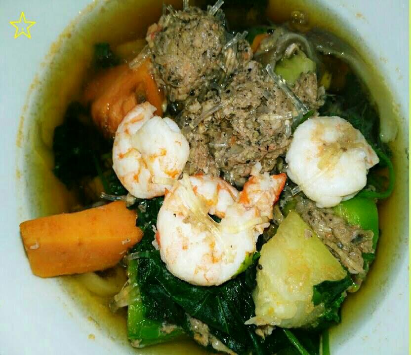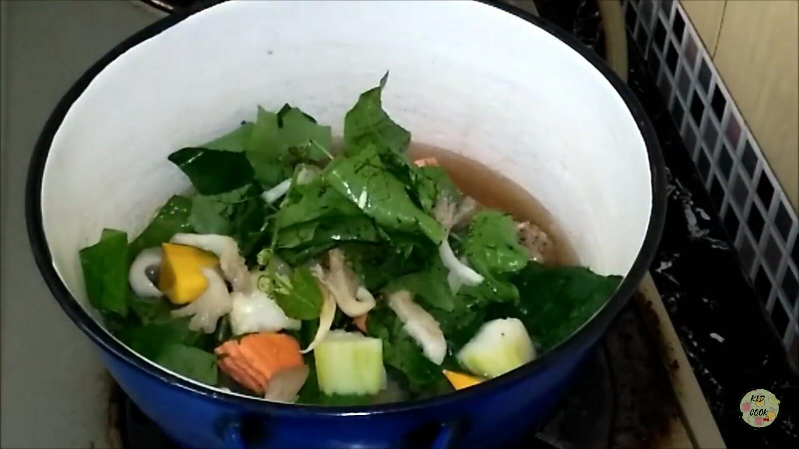 นำผัก เช่นตำลึง บวบ ฟักทอง ฟักเขียว เห็ดนางฟ้า และมันเทศ ใส่ลงไปในหม้อ แต่ใครจะใช้ผักอย่างอื่นก็ได้ค่ะ ใส่กุ้งที่เป็นตัวลงไปในหม้อด้วยสัก5-6ตัวค่ะ